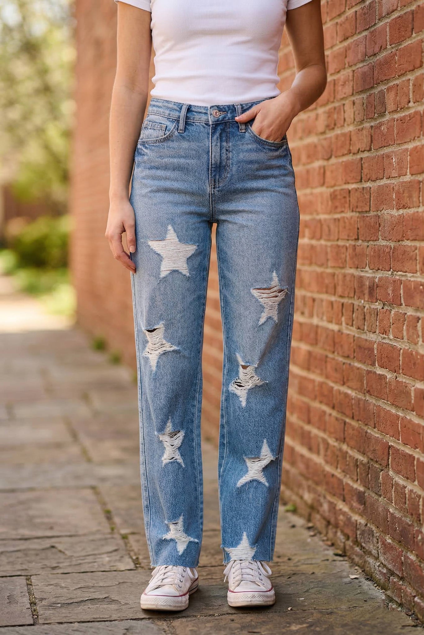 The High Waist Rigid Magic Star Shaped Destroy 90's Straight Jeans are a trendy and retro-inspired piece for any fashion lover. Their high waist design flatters the figure and enhances the silhouette. The magic star-shaped destroy details add a edgy and unique touch to the jeans. With a straight leg fit, these jeans offer a classic and timeless look. Perfect for those who love a vintage-inspired style with a modern twist.