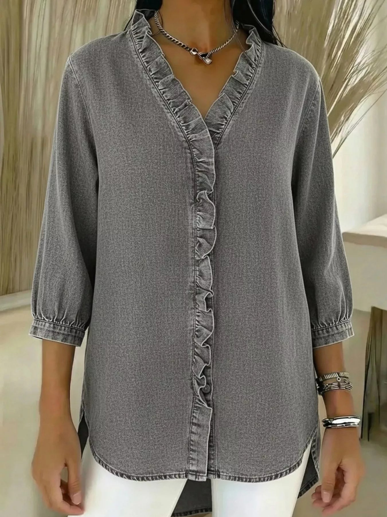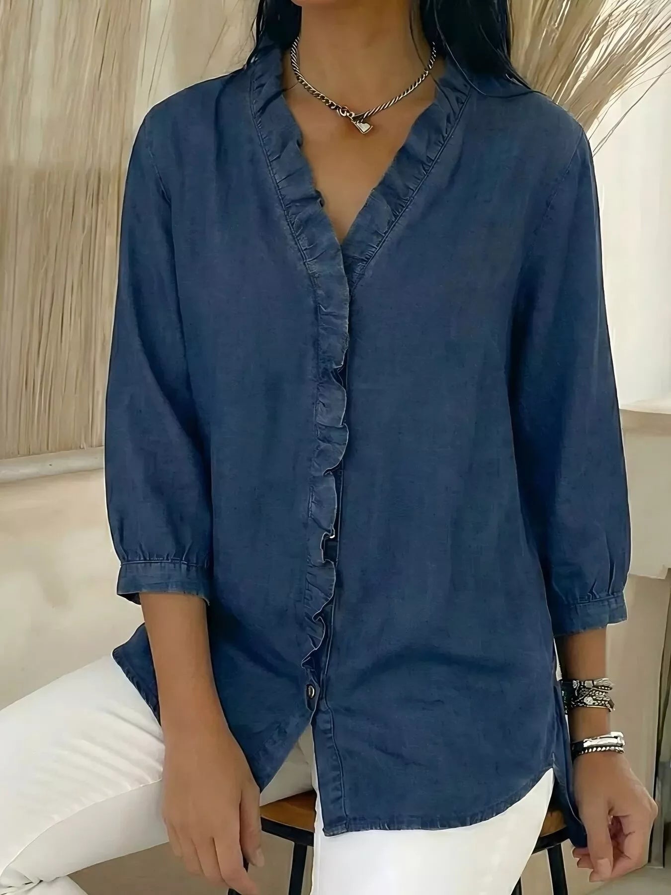 Elevate the everyday with a piece that balances structured elegance and romantic, feminine detail. The Driftwood Tide Ruffled Button-Down Shirt features a polished buttoned front and a sophisticated V-neckline, making it a versatile essential for both professional and casual styling. This design is defined by its artisanal ruffled trim along the placket and collar, paired with delicate ruched detailing on the sleeves to create a statuesque and curated silhouette. Crafted from high-quality 100% polyester, this top offers a crisp, no-stretch handle that maintains its voluminous and refined shape through every wear.