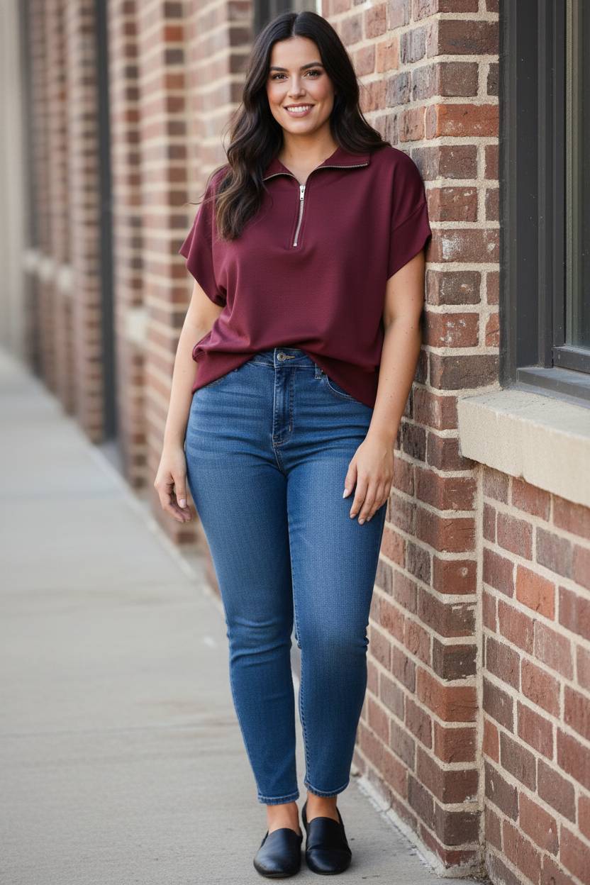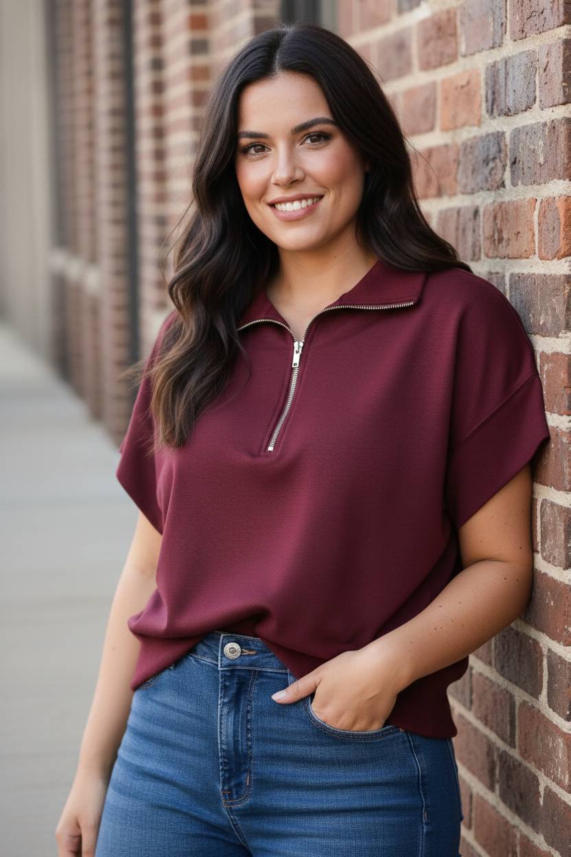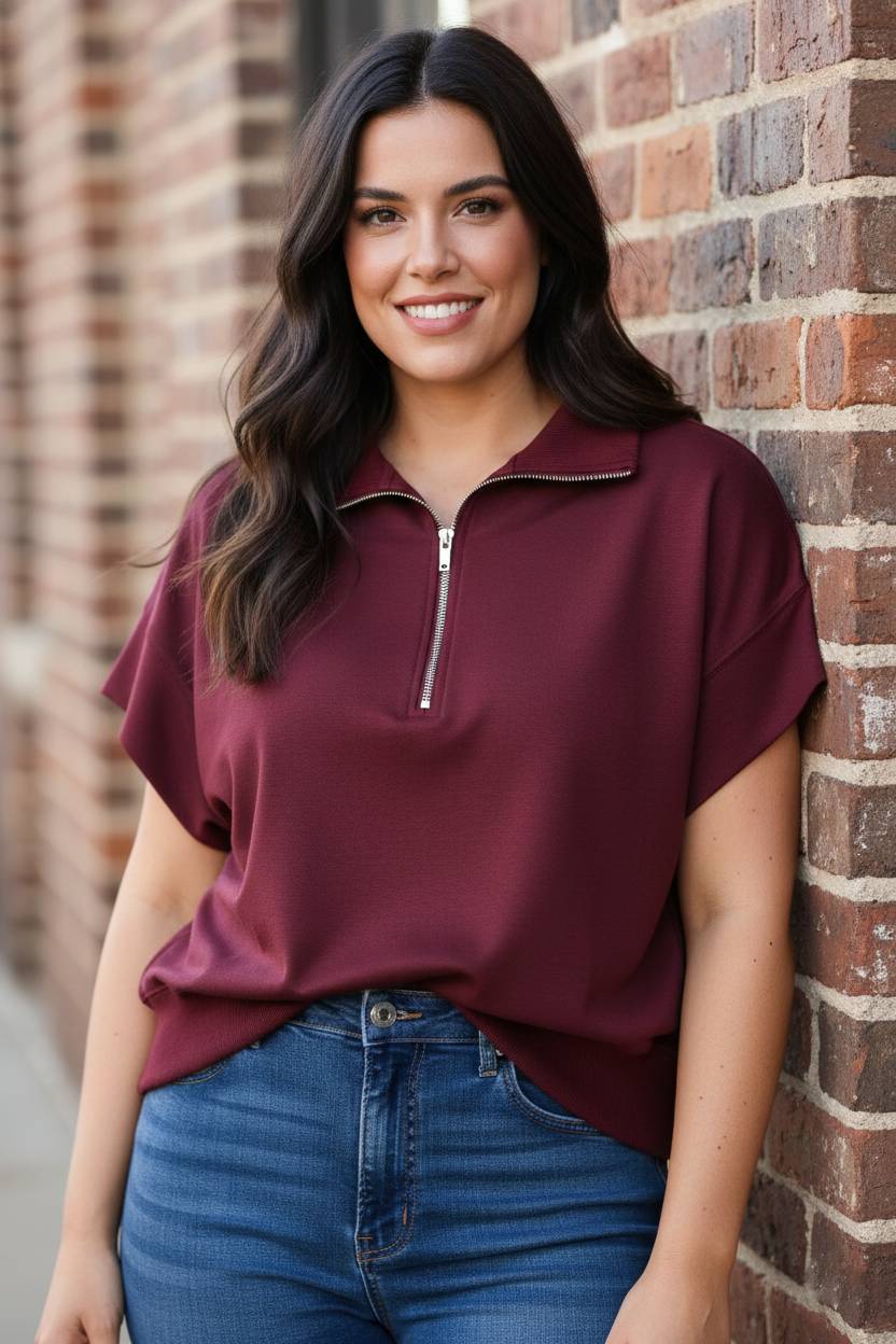 Master the art of polished, off-duty style with a piece designed for high-end boutique appeal and statuesque, daily comfort. The Morning Commute Top features a sophisticated, deep wine hue and a structured silhouette that effortlessly upgrades your casual rotation. This contemporary essential is defined by its architectural half-zip neckline, providing a "next level" look that balances urban edge with functional breathability. Crafted from a premium blend of 55% rayon, 40% polyester, and 5% spandex, this top delivers a soft-touch, high-end handle with slight stretch for a curated fit.