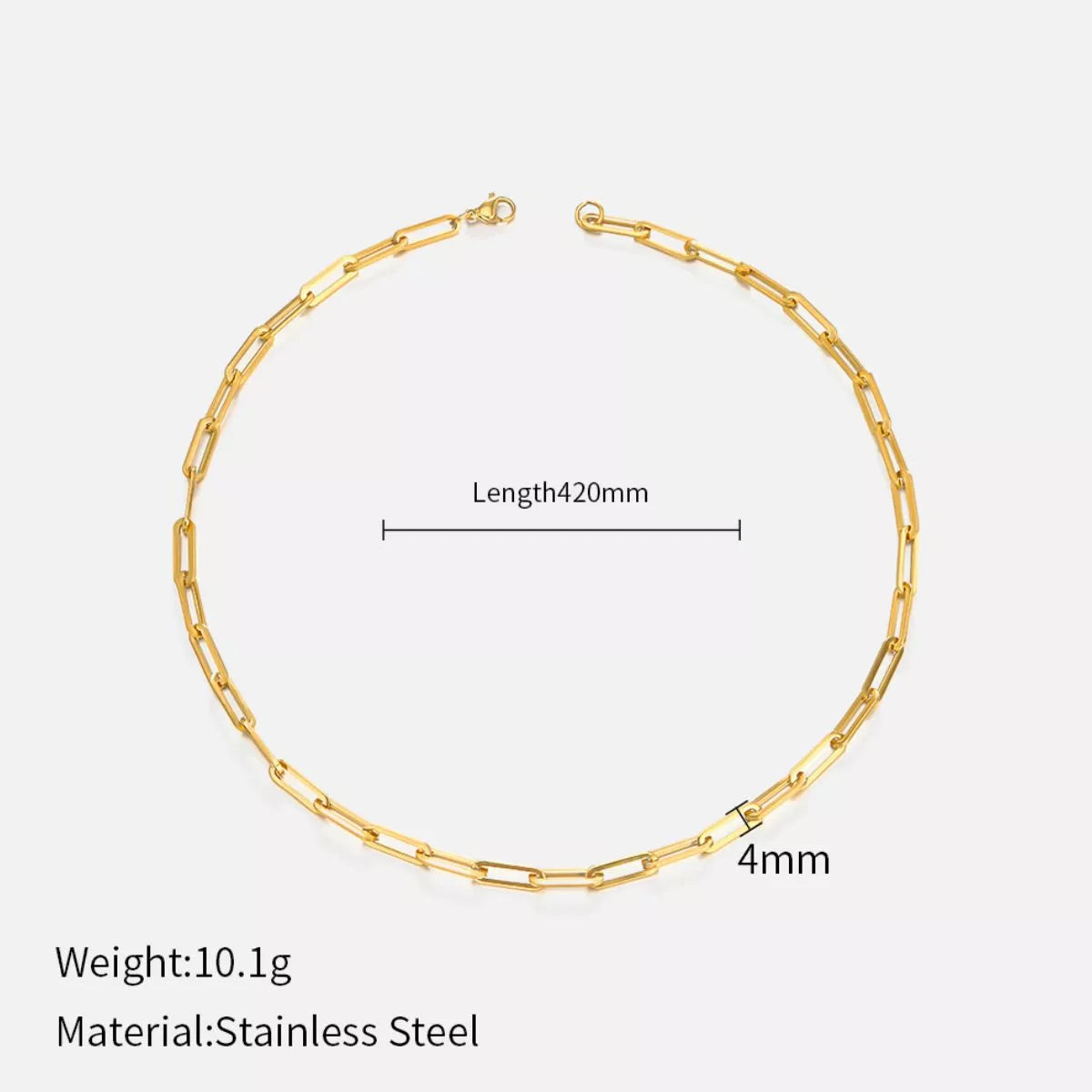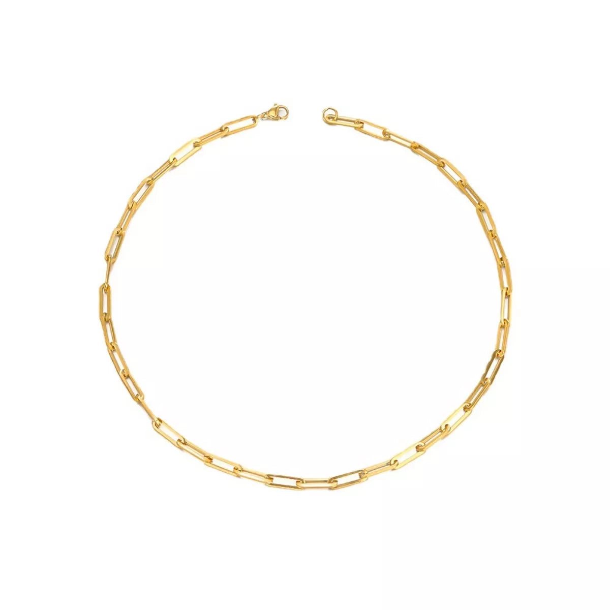 The iconic paperclip chain is defined by its elongated, sleek links, creating a modern, bold look. Made from durable stainless steel and finished with rich 18K gold plating, this necklace offers exceptional quality and shine. Wear it alone as a minimalist choker or layer it with longer, thinner chains to achieve a high-fashion, high-contrast stacked look.