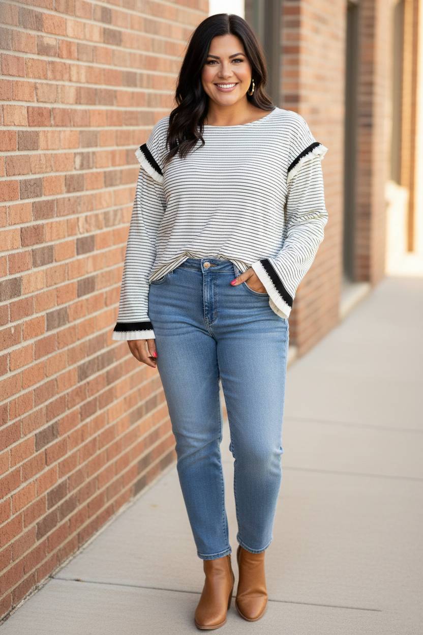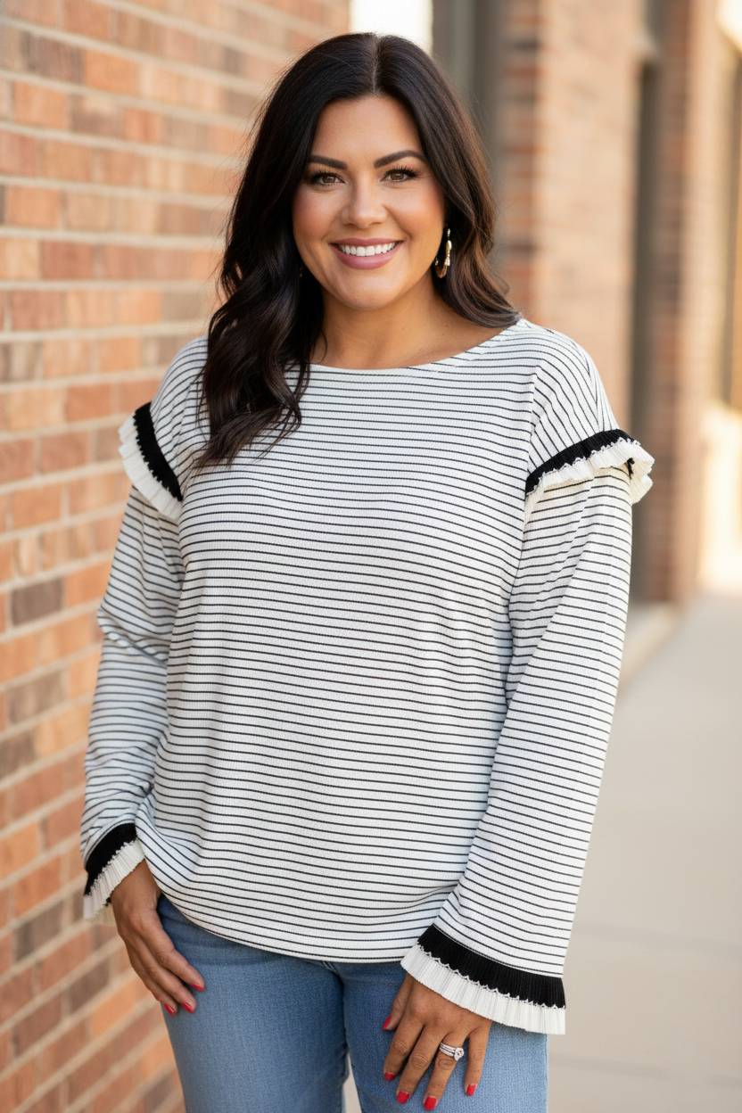 This piece features a clean horizontal stripe pattern set against a crisp white background, offering a timeless look with a modern twist. The design is elevated by delicate knit ruffle trim accented with contrasting black borders along the shoulders and cuffs, adding a touch of playful texture to the silhouette. Crafted from a soft, high-quality blend with slight stretch, this top provides a comfortable, flattering fit that is perfect for layering under a vest or wearing on its own for a polished daytime look.