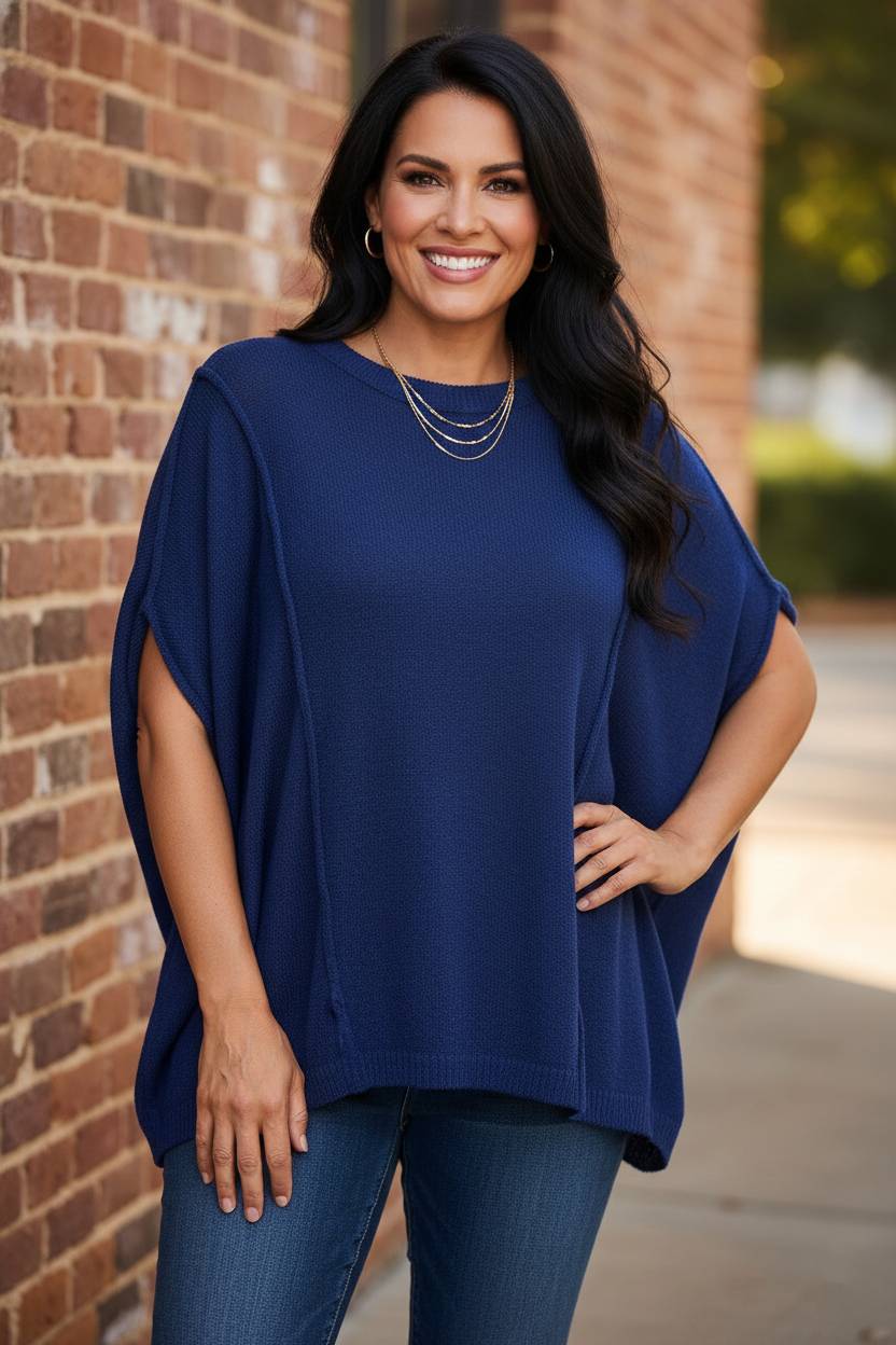 This versatile knit top features a soft, flowing silhouette with an easy drop shoulder design for a relaxed, laid-back look. The slightly stretchy, soft fabric makes it comfortable for year-round wear, perfect for layering or wearing on its own. Finished with a subtle seam detail and a wide scoop neck, this top adds understated elegance to any outfit.