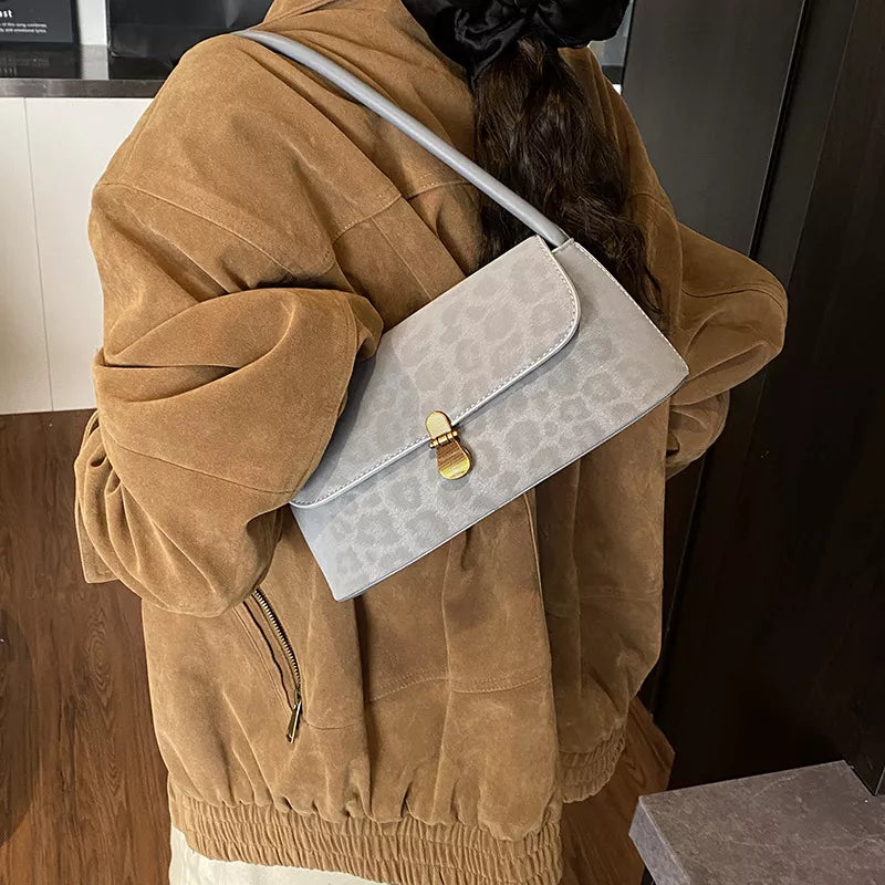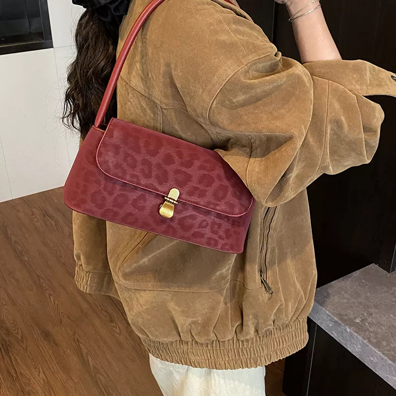 Embrace the high-fashion return of the baguette bag with City Sleek Leopard Shoulder Bag! This essential small bag features a subtle, sophisticated leopard print embossed onto a soft, suede-like body. The clean, structured silhouette is secured by a chic gold-tone flip clasp on the flap. With a comfortable shoulder strap that sits perfectly under the arm, this compact bag adds a touch of modern luxury and texture to any look. Available in a spectrum of rich, versatile colors!