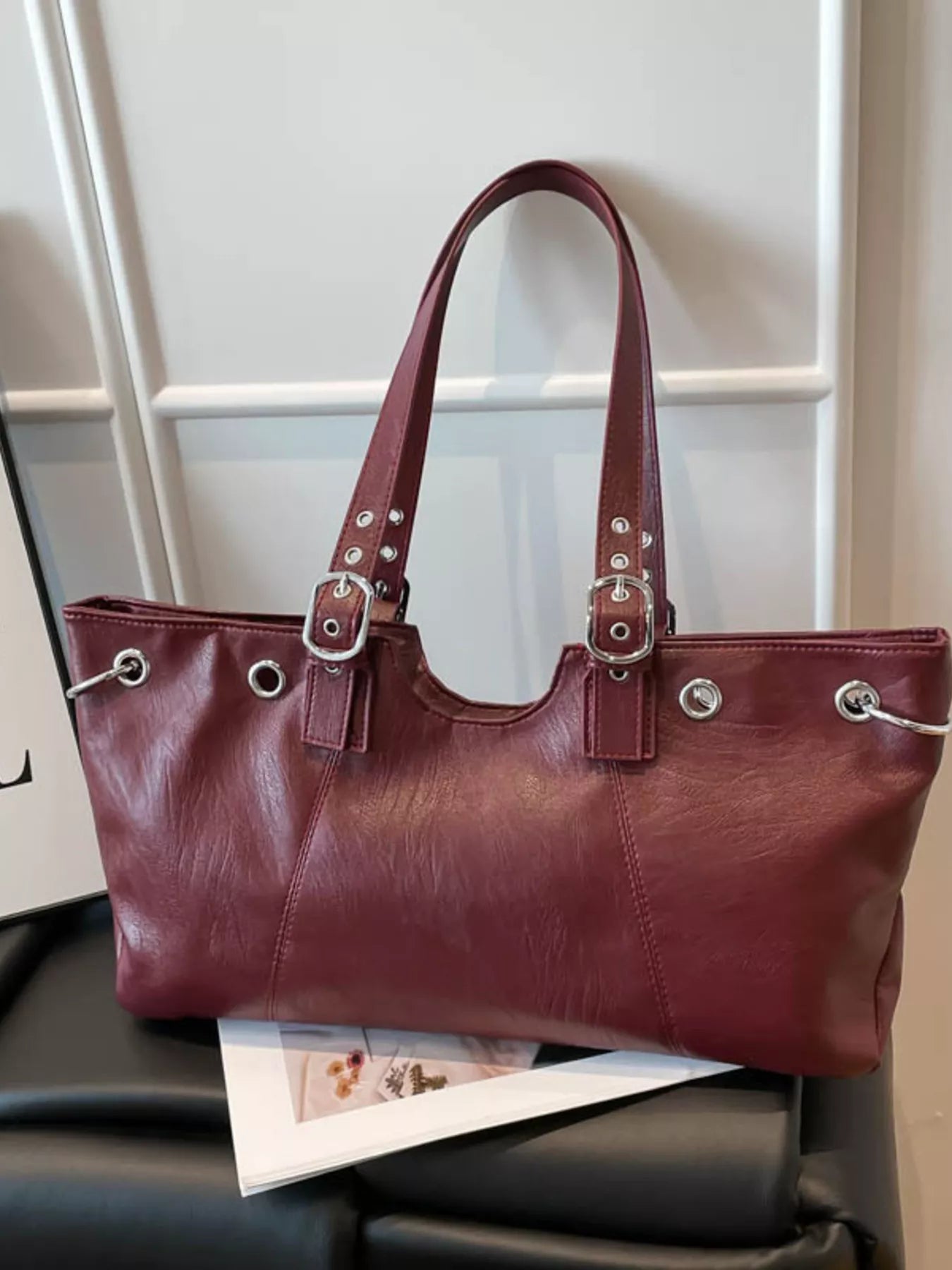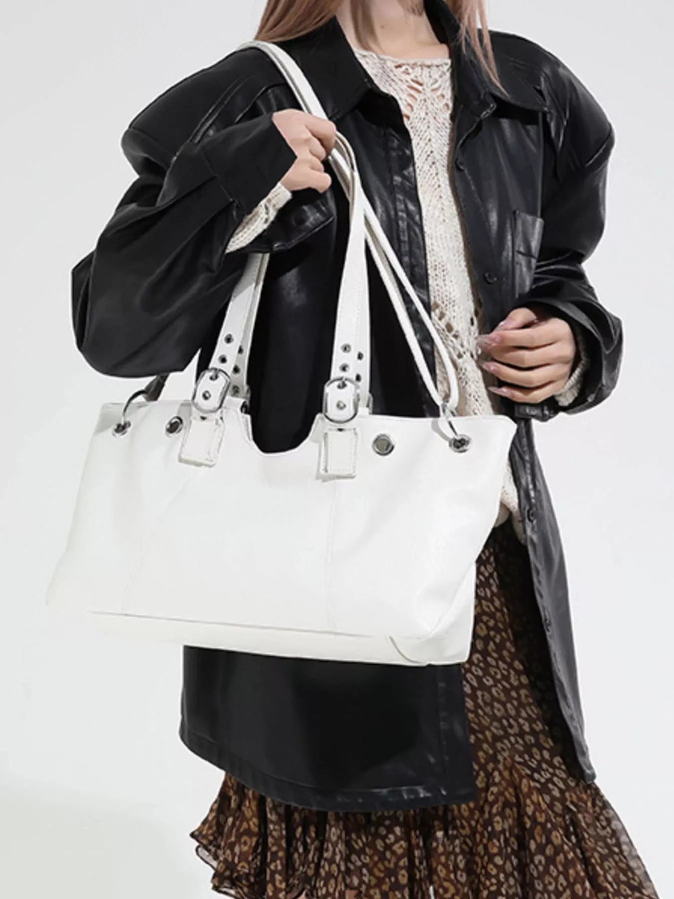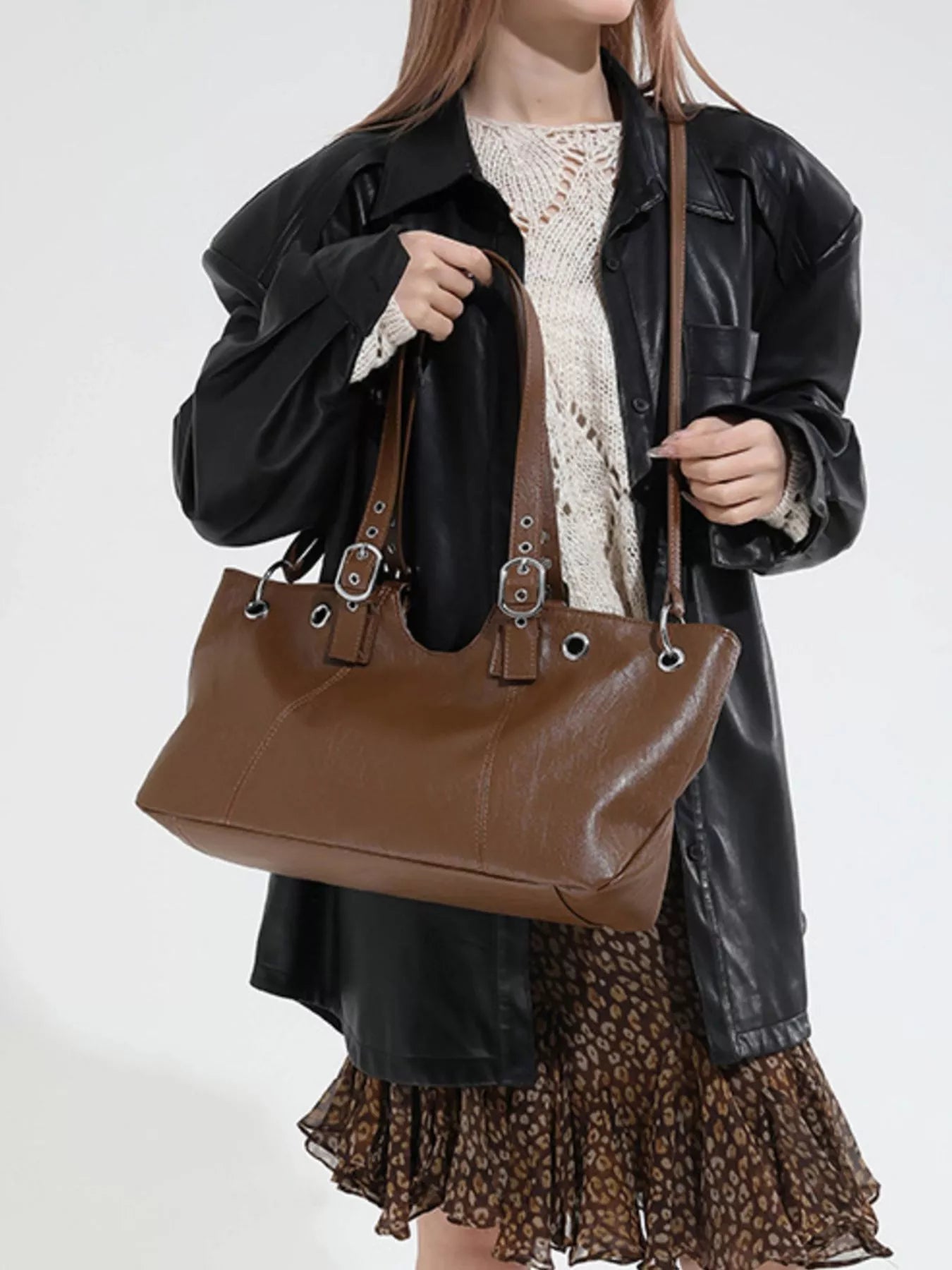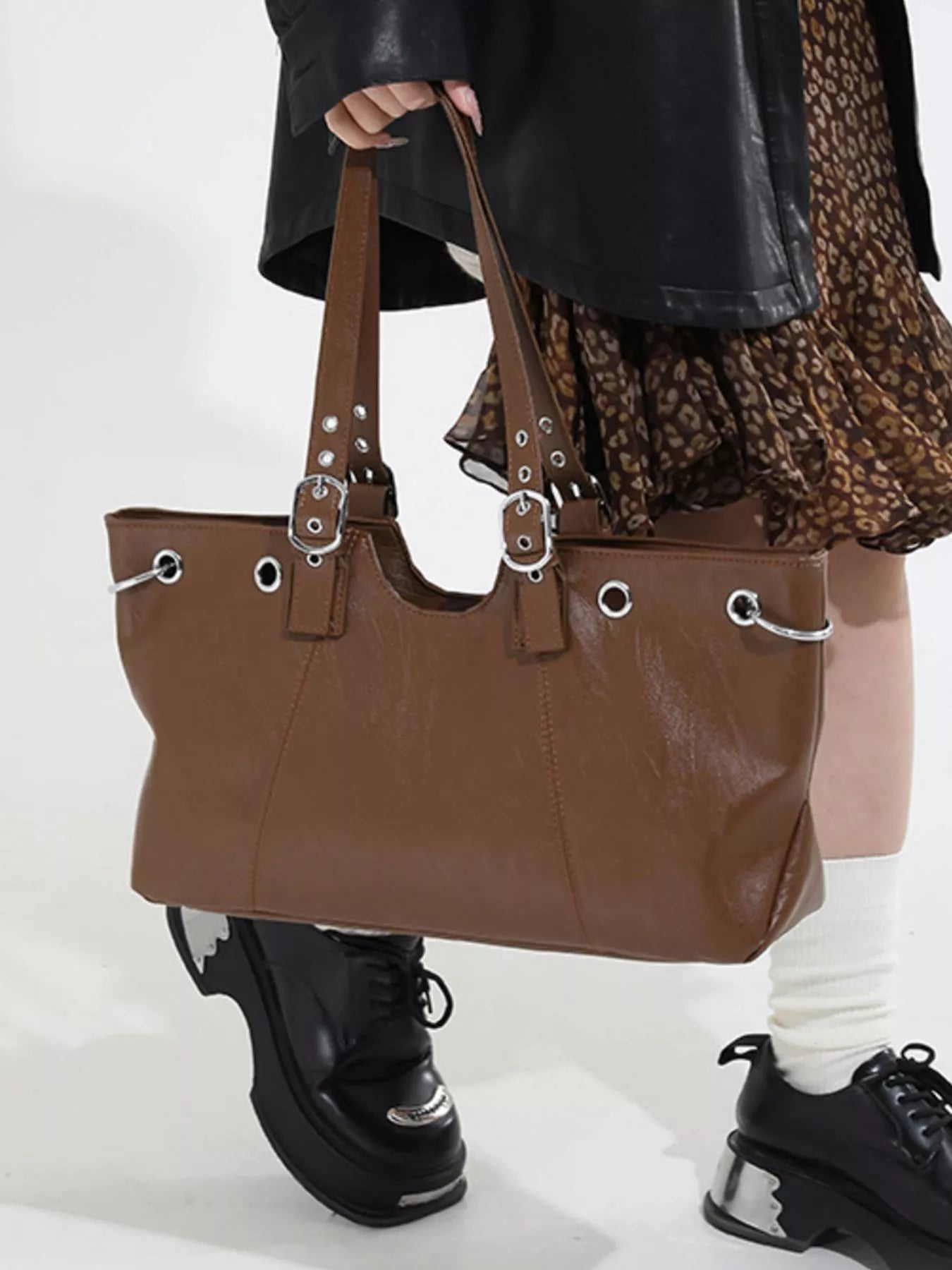 Command the day with the City Luxe Heritage Tote, a piece that seamlessly blends vintage character with modern sophistication. Crafted from premium PU Vegan Leather with a rich, textured grain, this large-capacity bag is designed for the woman on the move. Its structured silhouette is elevated by striking silver-toned hardware, featuring bold grommets and distinctive buckle-accented straps that evoke a high-end, editorial feel. Whether you’re navigating the morning commute or heading to a late-afternoon gallery opening, this tote provides ample space for your laptop, essentials, and more, all while maintaining a sleek, professional profile.