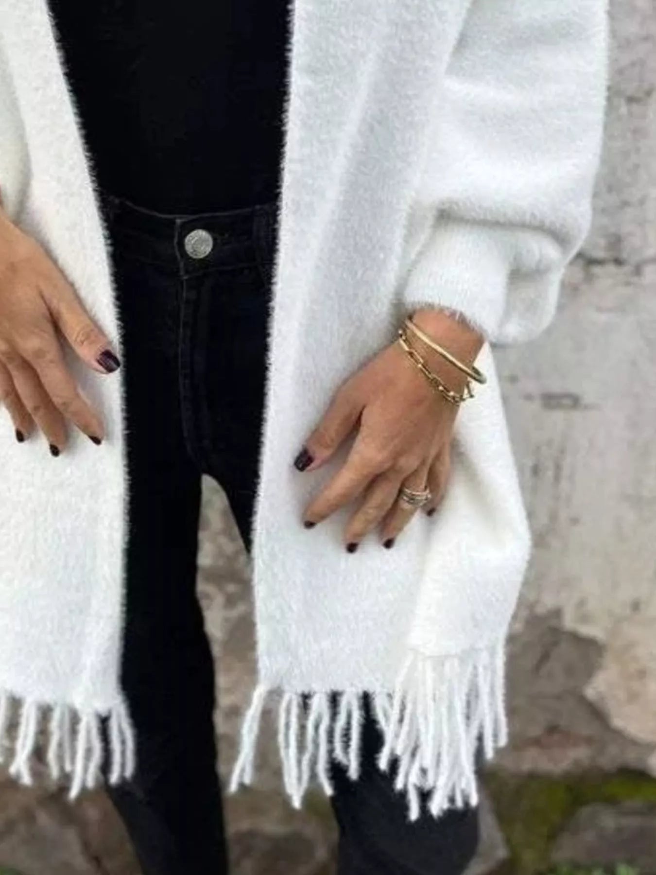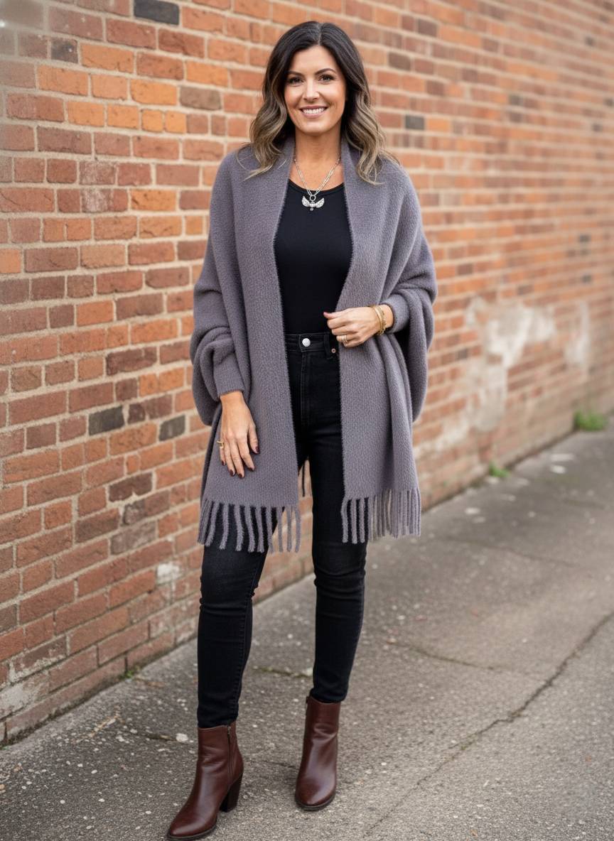 The Haven Mist Cardigan is designed with an effortless, oversized silhouette that flows beautifully over any ensemble. It features a sophisticated shawl collar and uniquely draped sleeves that provide a cape-like feel, offering both warmth and high-fashion style. The standout detail is the delicate tassel fringe along the hem, adding a touch of playful movement and artisanal texture. Crafted from a soft, high-quality knit, this cardigan is the ultimate layering piece for crisp morning commutes or cozy evenings by the fire.