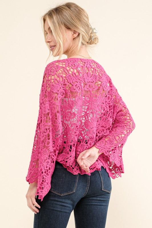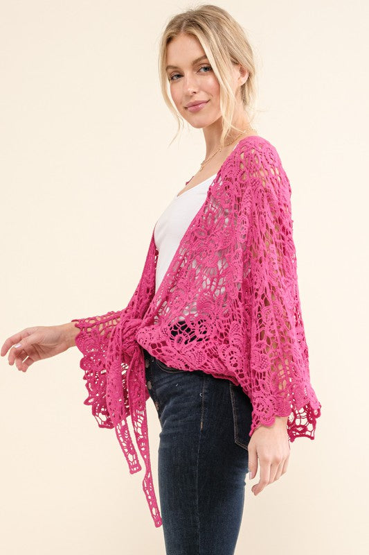 This versatile front tie bell sleeve crochet cardigan in a beautiful fuchsia is the perfect summer staple Get instant chic styling with all your ensembles with this stunner!