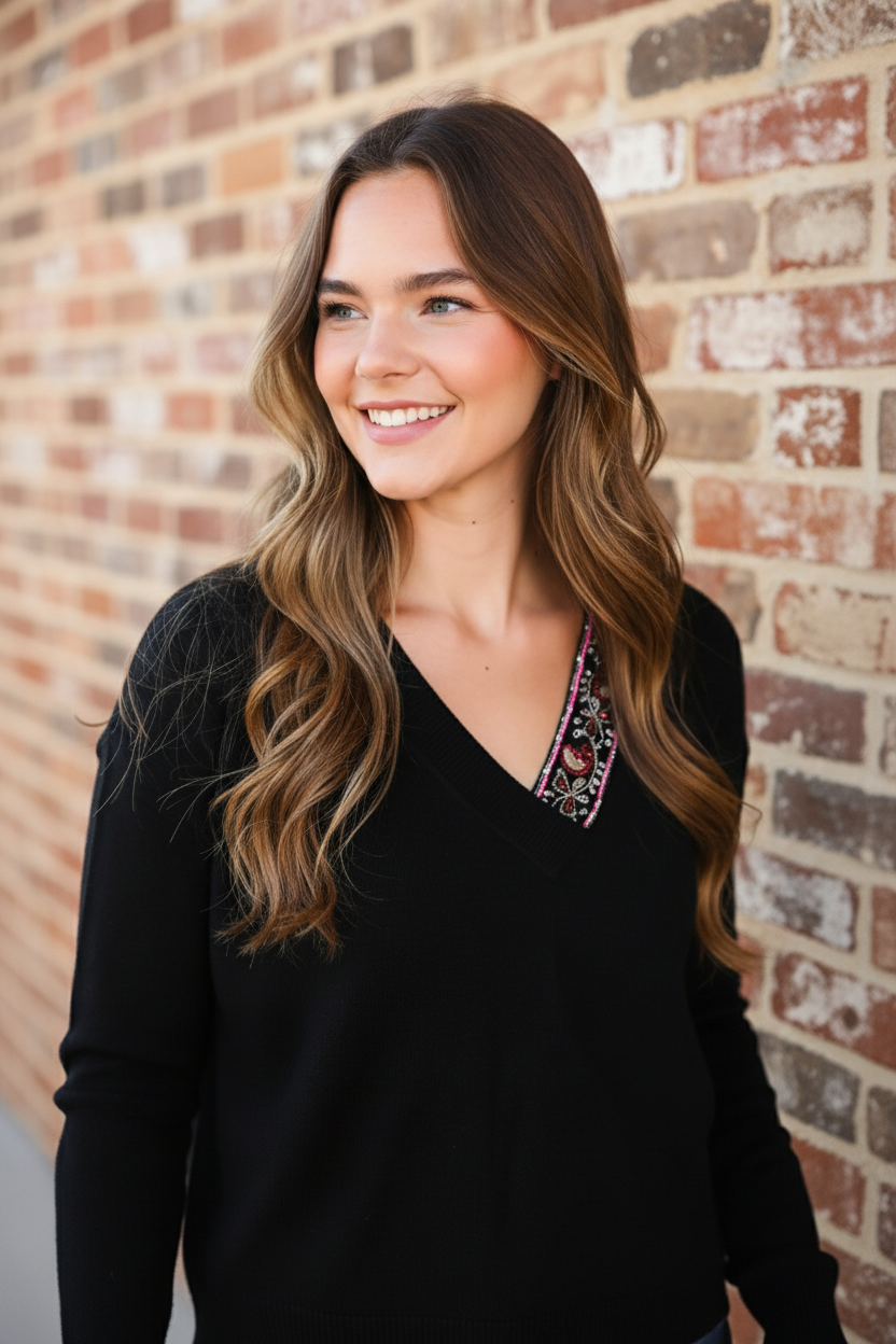 Effortlessly chic! This sweater has gorgeous beading at the neck that elevates this very cozy sweater.