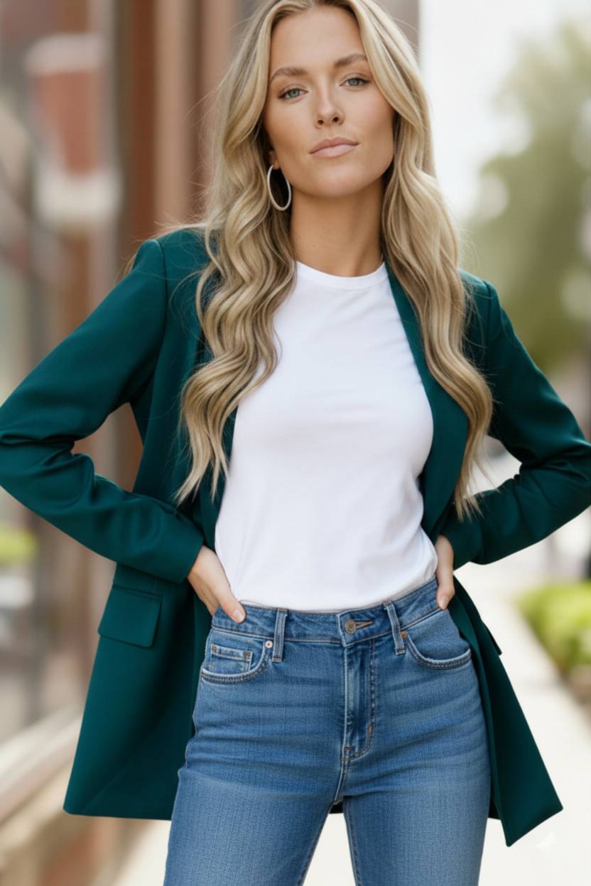 Bring your boss energy wherever you go in the City Chic Blazer! This sleek, deep green statement piece is the perfect blend of classy and cool. It has clean lines, flap pockets, and just the right amount of structure. Dress it up with trousers for that meeting-ready moment, or throw it over a graphic tee and denim shorts for an off-duty, downtown vibe. From coffee runs to cocktails, this blazer means business… in style.