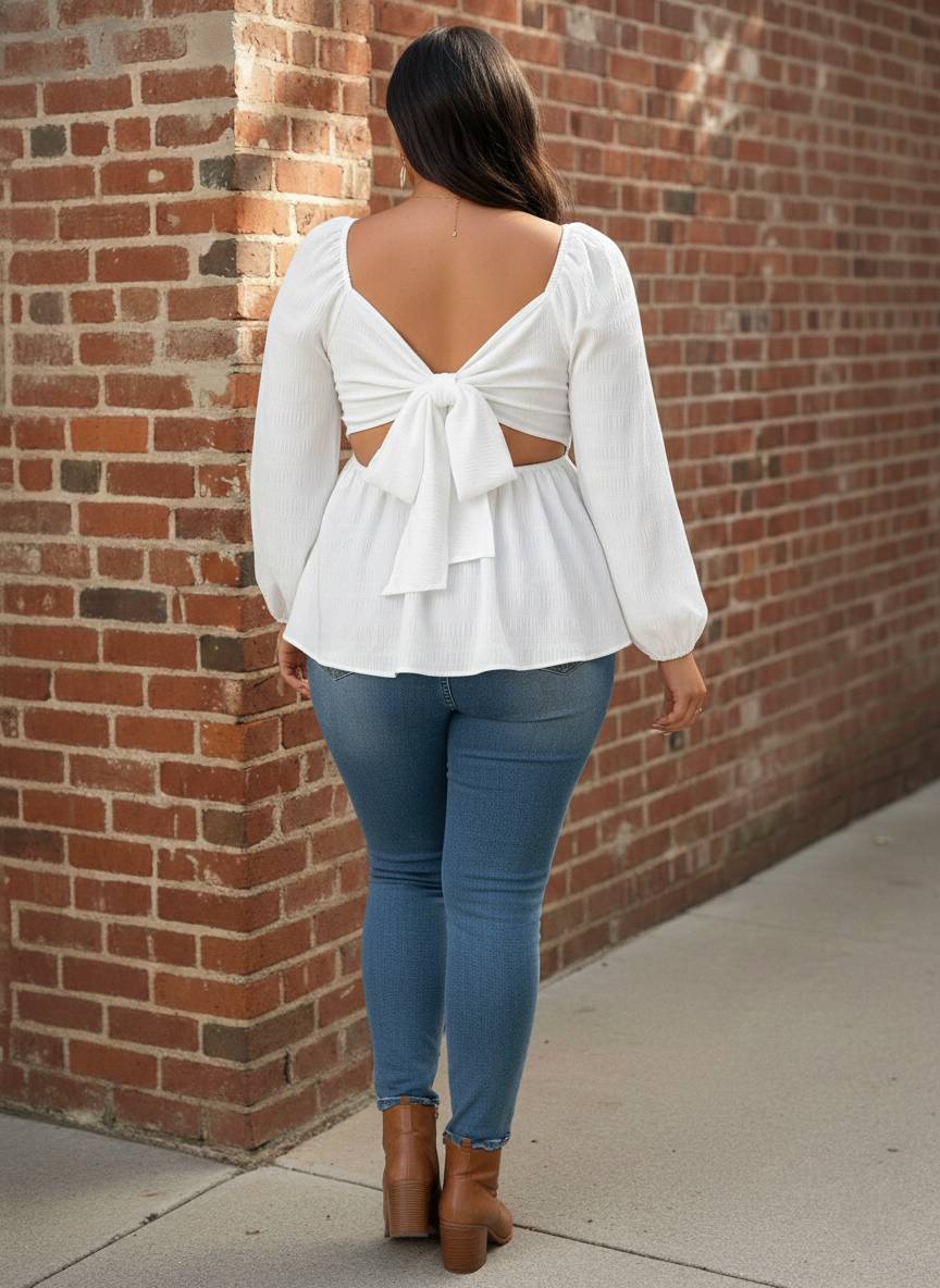 Elevate your curated collection with a piece that radiates sophisticated femininity and statuesque charm. The Avenue Elegance Blouse is defined by a striking square neckline and voluminous long sleeves, creating a balanced silhouette that is both modern and timeless. This boutique standout features a delicate textured fabric and a flattering peplum waist that flares gracefully for a polished, high-end look. The true showstopper is the dramatic back bow detail and airy cutout, adding a whimsical, hand-crafted touch to your ensemble. Crafted from high-quality 100% polyester, this no-stretch top maintains its structured, elegant shape from your morning meetings to evening gallery openings.