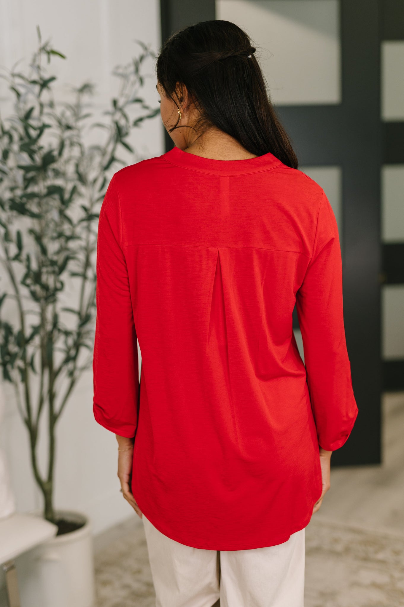 Transform your closet with the Lizzy Top. Made from Bulgari fabric, this top features a gabby neckline and rolled sleeves with button tabs for a comfortable, yet eye catching piece. The 3/4 sleeve and scoop hem add flow to the already stylish piece. Experience comfort and style in one with the Lizzy Top.