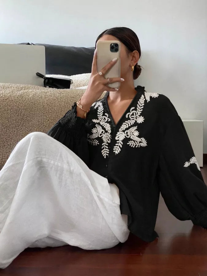 This top features a striking notched neckline that leads into a delicate button-down front, accented by timeless pearl-like buttons. The standout feature is the beautiful, contrast white floral embroidery that frames the neckline and shoulders, offering an artisanal feel. Designed with dramatic billowing puff sleeves and elegant smocked cuffs, this 100% polyester blouse offers a sophisticated, non-stretch silhouette that transitions perfectly from the office to dinner.