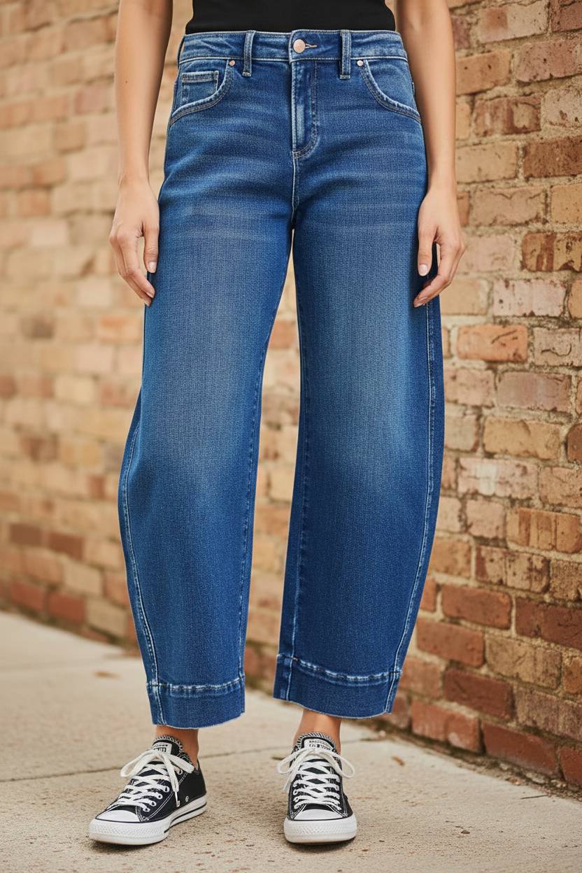 Mid rise crop barrel jeans typically refer to a style of jeans that have a mid-rise waist (sitting between the natural waist and the hips) and a cropped length that hits above the ankle. The term "barrel" may refer to a wider, more relaxed fit through the leg, similar to a straight or slightly tapered style. These jeans tend to be casual and versatile, perfect for everyday wear.