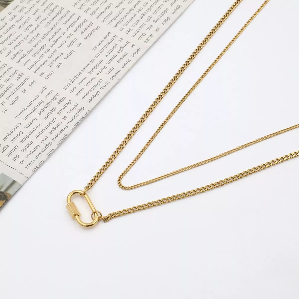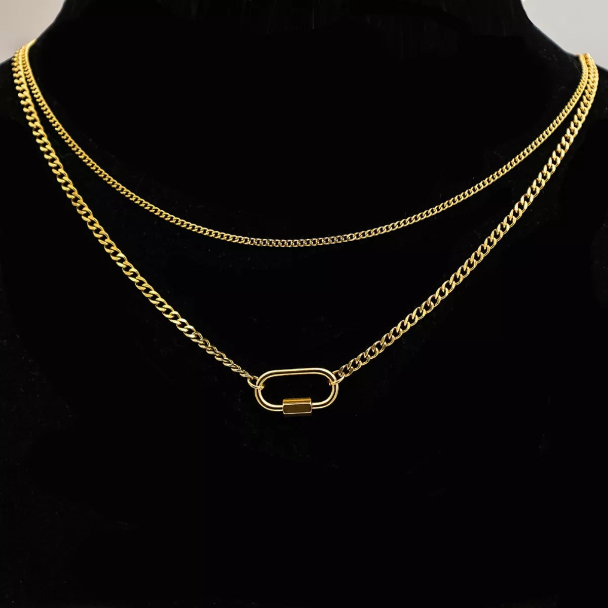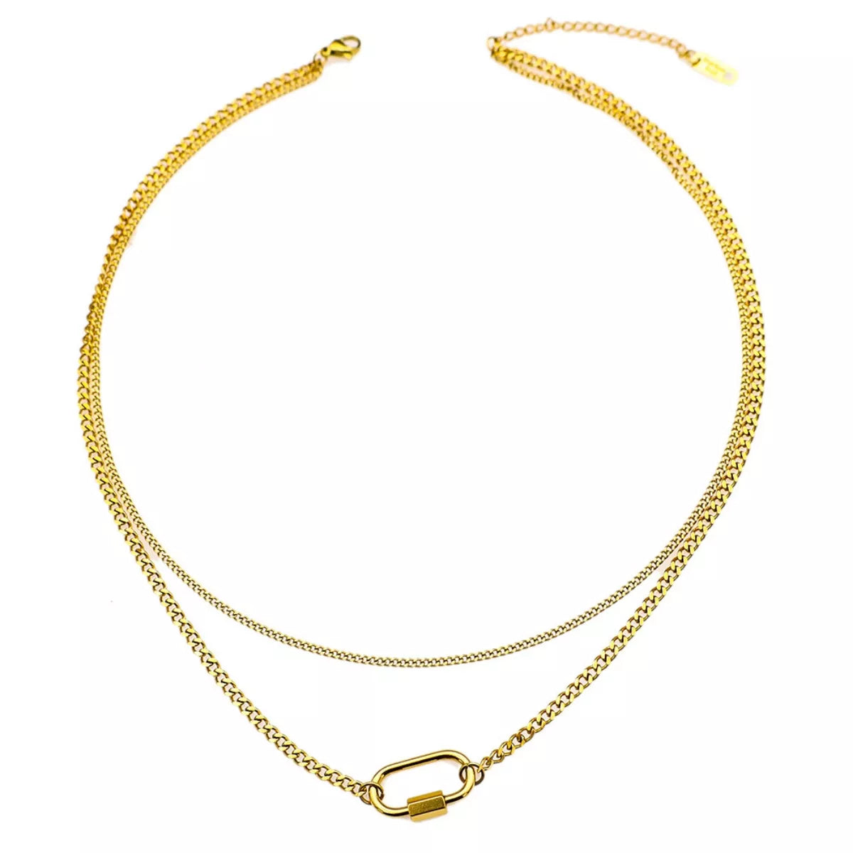 This sleek piece features two perfectly coordinated chains designed for an effortless stacked look. The top layer is a delicate, fine-link chain that sits beautifully against the collarbone, while the bottom layer features a bolder curb link chain anchored by a unique carabiner-style pendant. Crafted from durable stainless steel and finished with a rich 18K gold plating, this tarnish-resistant necklace offers high-impact architectural style in one simple piece.