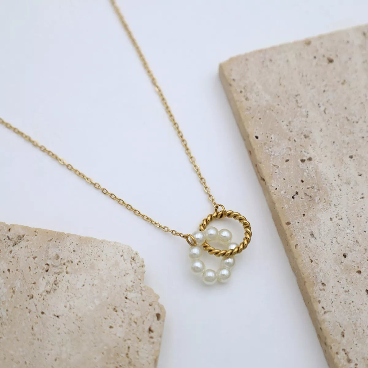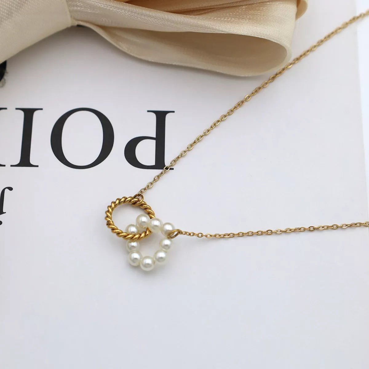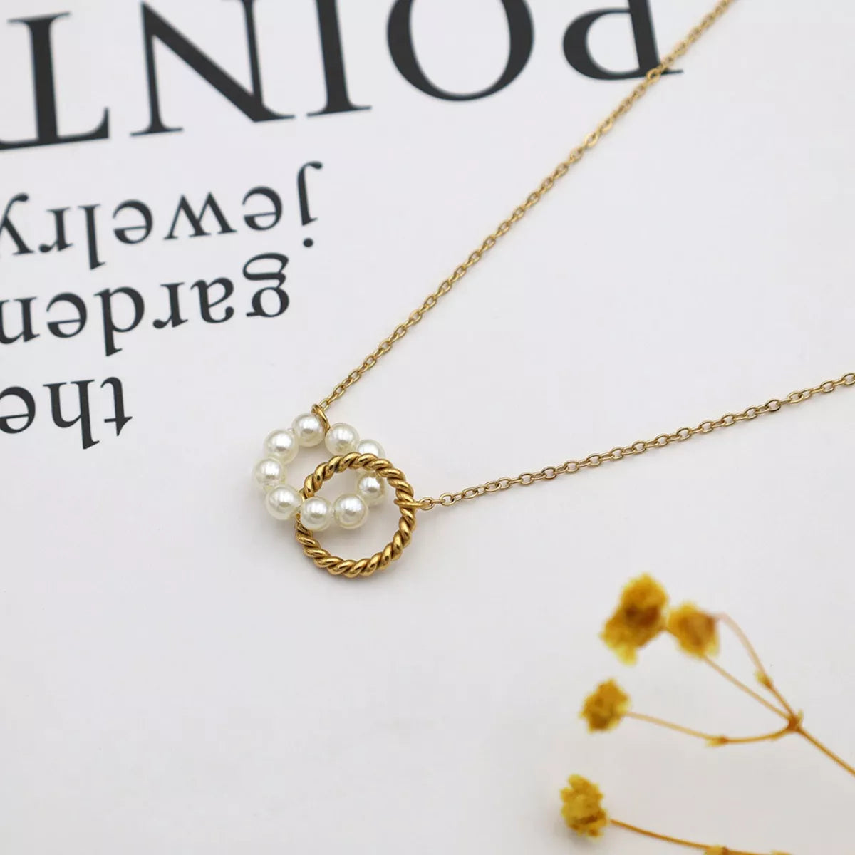 This piece features two interlocking circles that create a beautiful sense of movement and harmony. One circle is crafted from a rich, 18K gold-plated stainless steel with a delicate twisted rope texture, while the other is composed of a seamless ring of shimmering synthetic pearls. Suspended from a dainty gold-tone chain, this necklace offers a sophisticated, multi-dimensional look that transitions effortlessly from a professional blouse to an elegant evening dress.