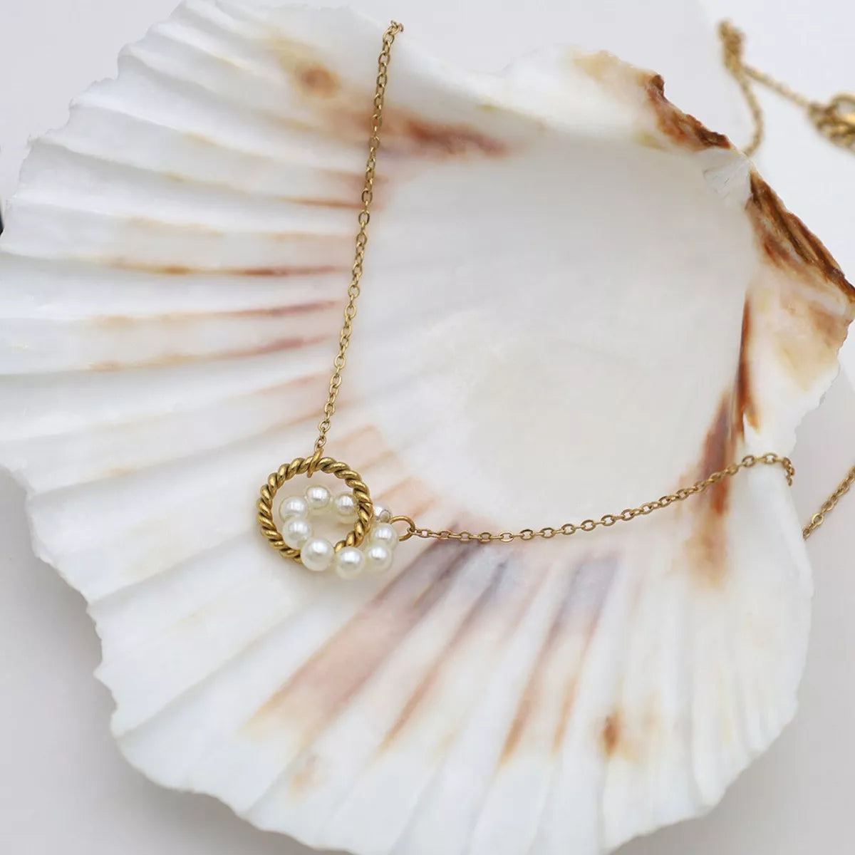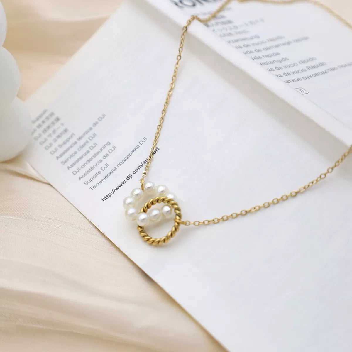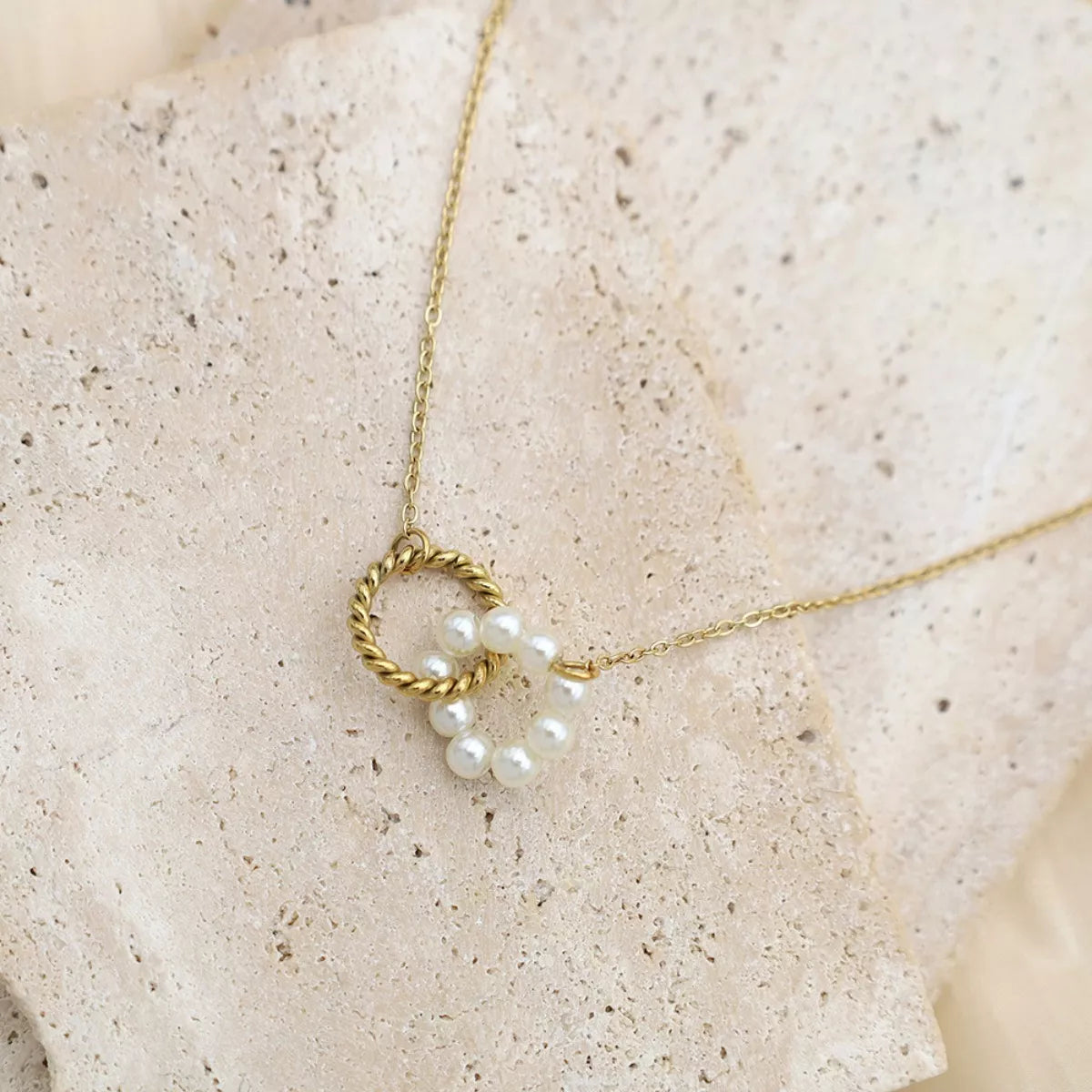 This piece features two interlocking circles that create a beautiful sense of movement and harmony. One circle is crafted from a rich, 18K gold-plated stainless steel with a delicate twisted rope texture, while the other is composed of a seamless ring of shimmering synthetic pearls. Suspended from a dainty gold-tone chain, this necklace offers a sophisticated, multi-dimensional look that transitions effortlessly from a professional blouse to an elegant evening dress.