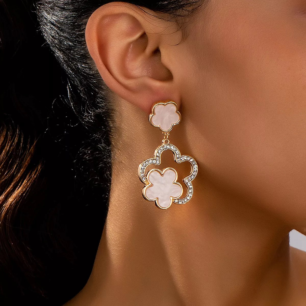 Make a dazzling entrance with the Boulevard Blossom Drop Earrings! These stunning pieces feature a double clover-inspired design dripping in glamour. Each earring pairs a chic solid resin flower stud with an intricate dangling charm outlined in sparkling rhinestone accents. Finished with luxurious 18K Gold Plating, these earrings offer high-end style without the price tag. Choose between the classic Jet Black for evening elegance or the soft Marble Pink for a feminine daytime look.