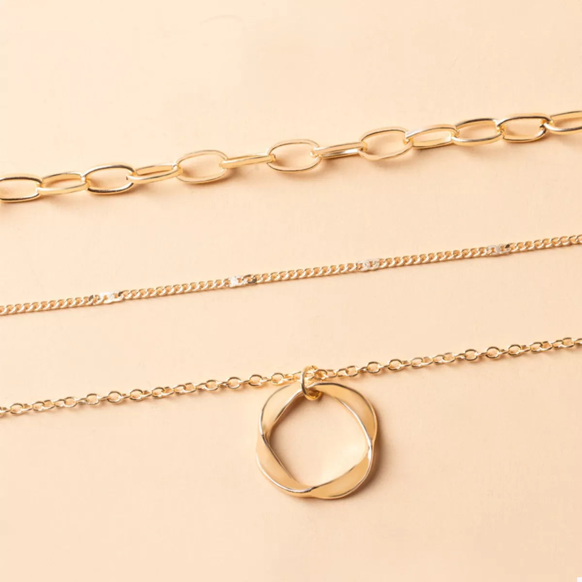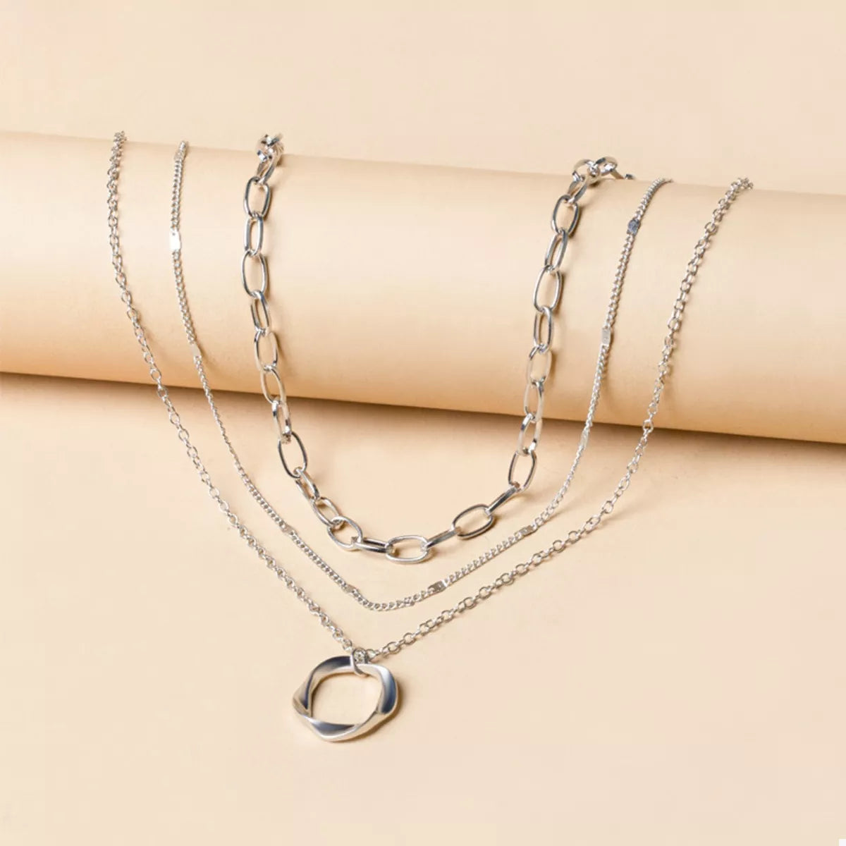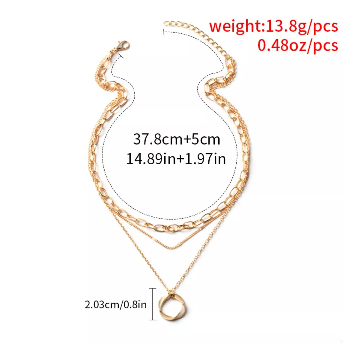 Get the perfect jewelry stack instantly with Golden Hour Interlocked Trio Necklace! This single-piece design does all the layering work for you, combining three distinct chains for a high-impact, minimalist look. It features a bold paperclip chain, a delicate classic chain, and a final layer dropping to a beautiful, hammered interlocked circle pendant. Finished with brilliant 18K Gold Plating (or silver plating), this piece adds instant luxury and texture to any neckline.
