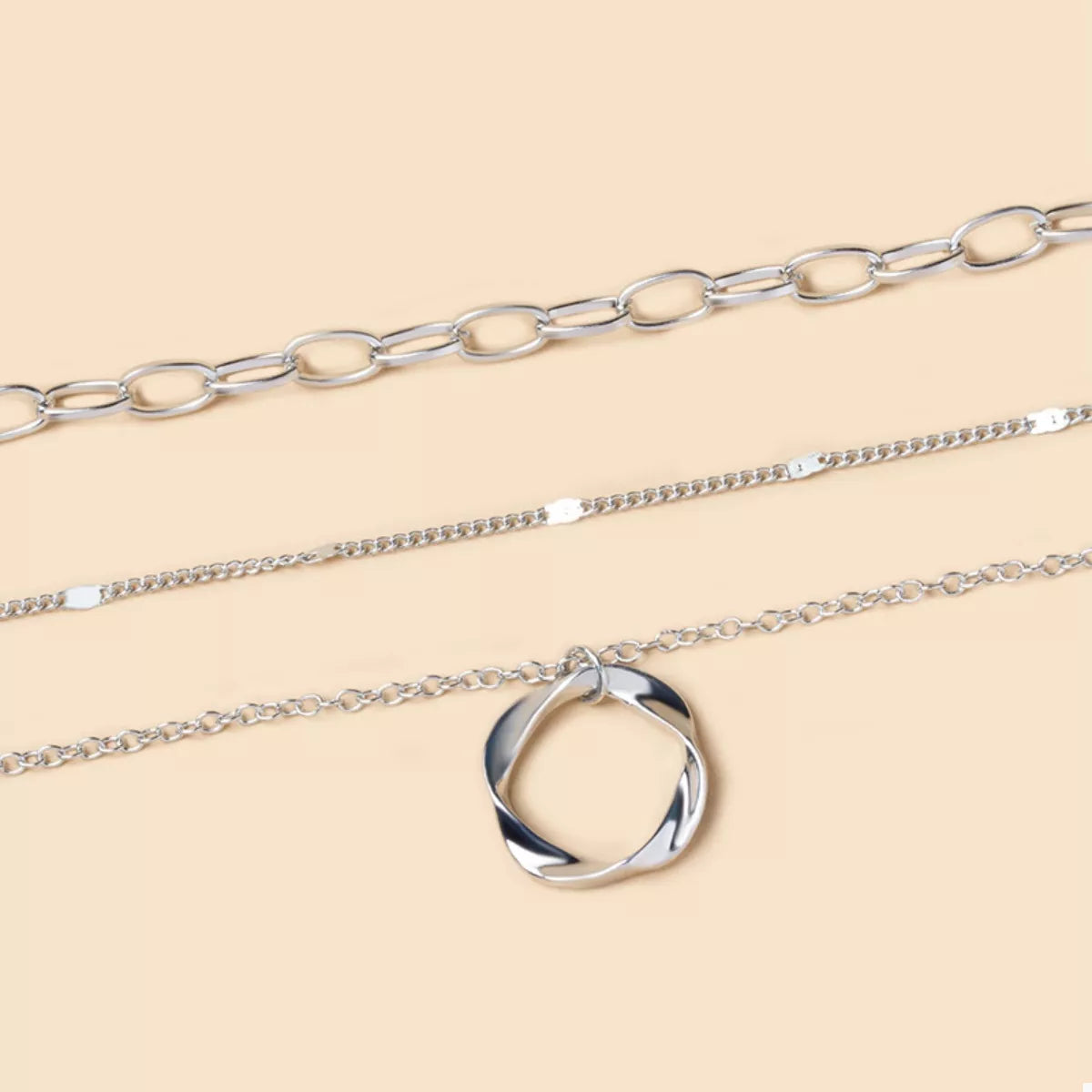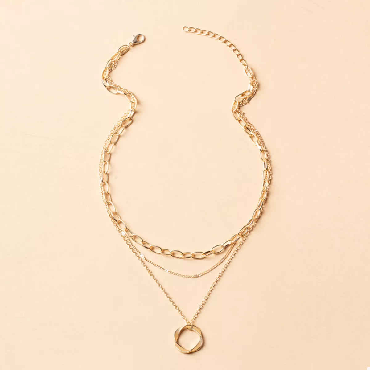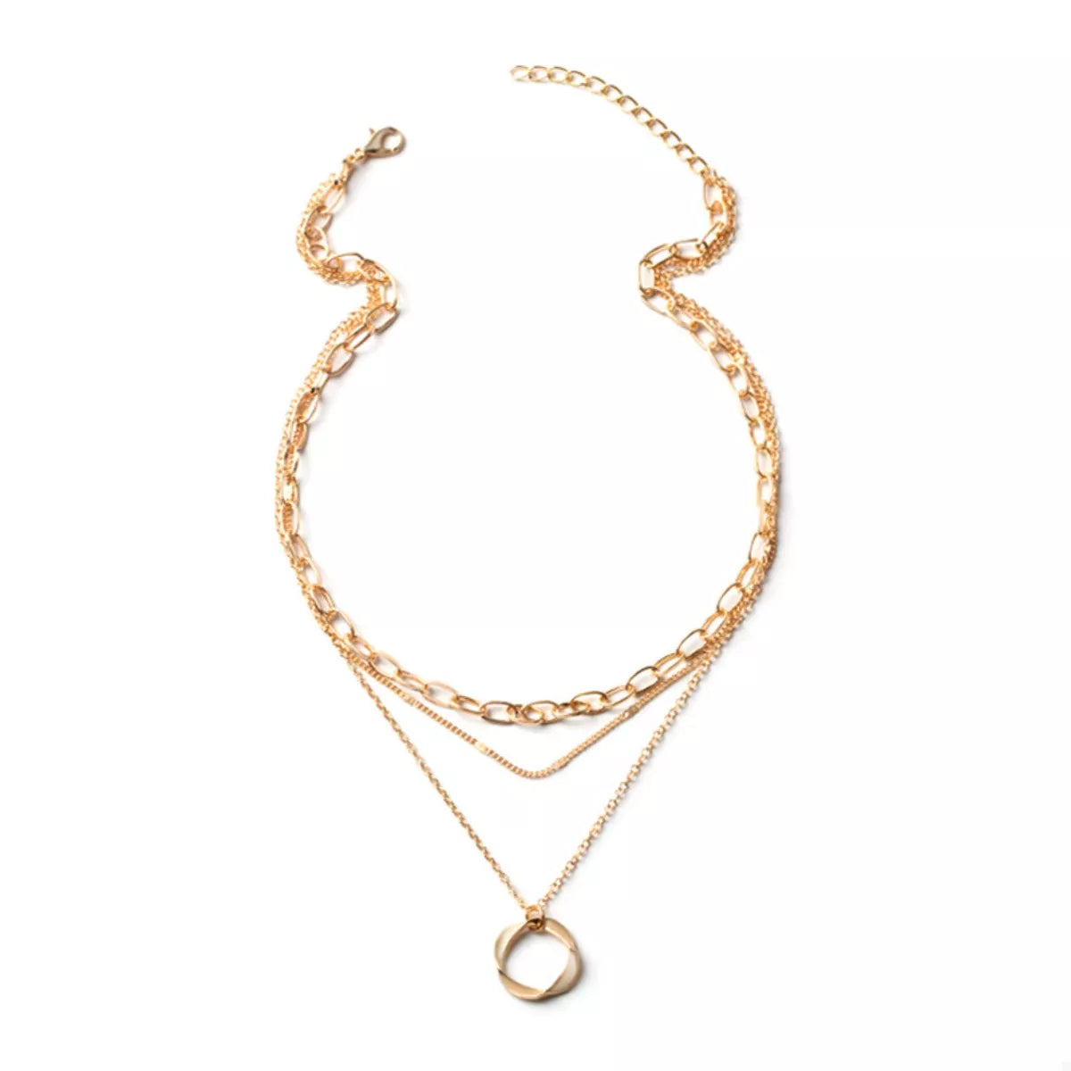 Get the perfect jewelry stack instantly with Golden Hour Interlocked Trio Necklace! This single-piece design does all the layering work for you, combining three distinct chains for a high-impact, minimalist look. It features a bold paperclip chain, a delicate classic chain, and a final layer dropping to a beautiful, hammered interlocked circle pendant. Finished with brilliant 18K Gold Plating (or silver plating), this piece adds instant luxury and texture to any neckline.