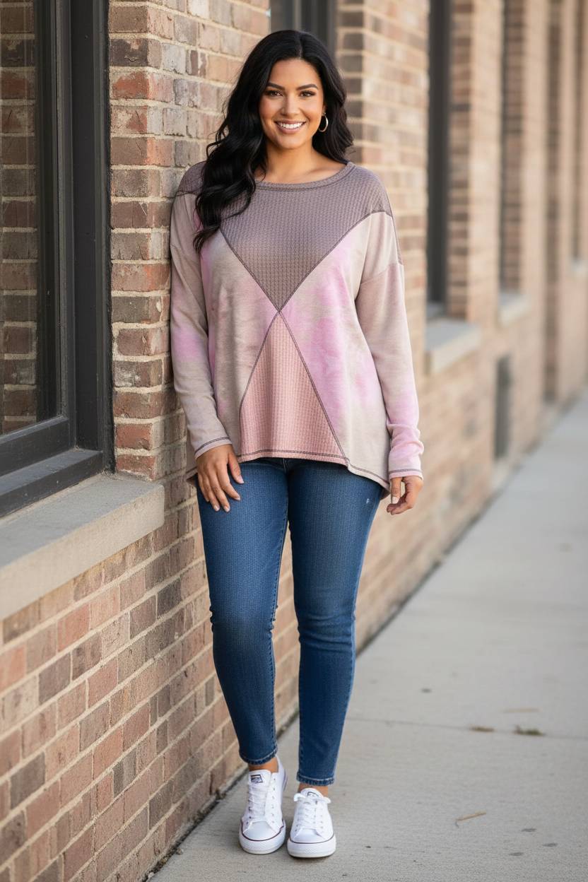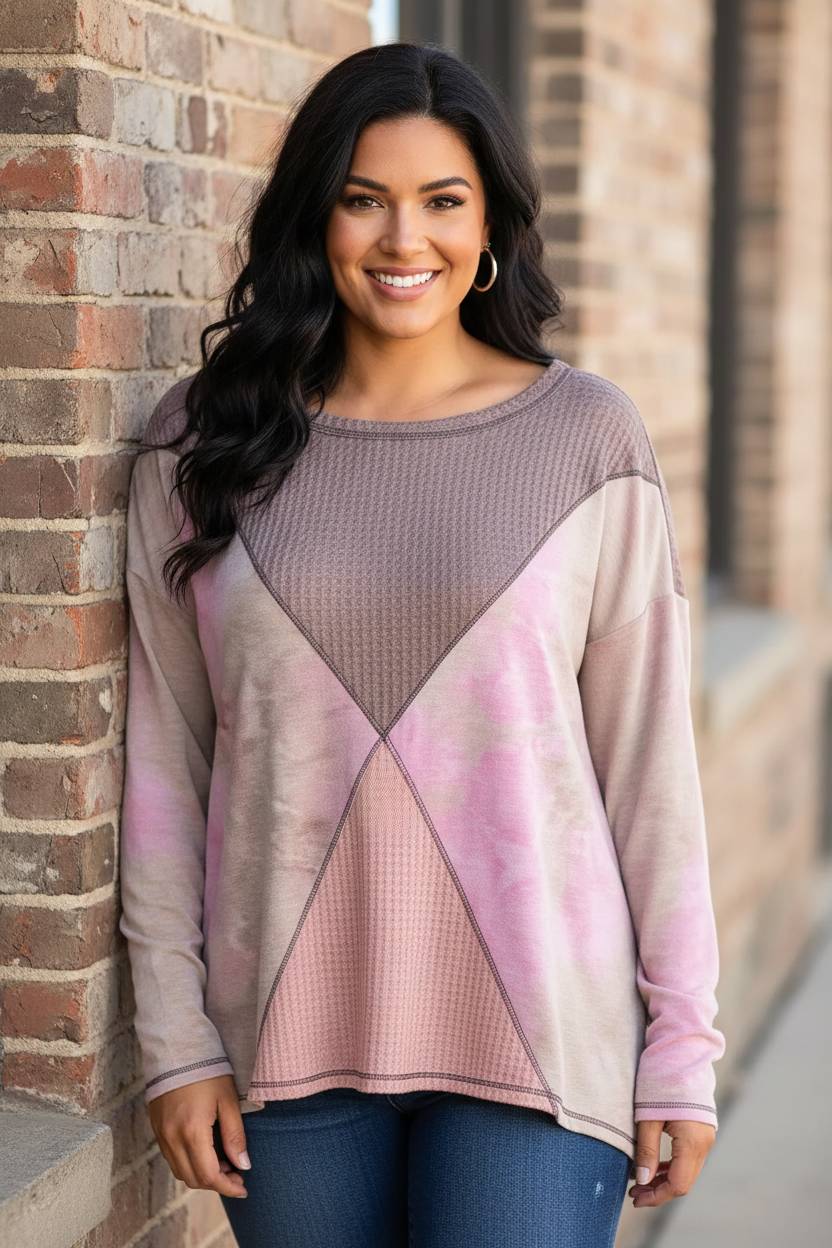 Embrace the art of curated comfort with a piece that masters the art of statuesque layering and artisanal texture. The Morning Mist Top features a sophisticated color block construction, blending a refined taupe waffle-knit panel with soft, cloud-like tie-dye accents in muted pink and lavender. This contemporary essential offers a "next level" take on the classic thermal, providing a playful fusion of patterns that ensures your off-duty style remains effortlessly boutique-ready. Crafted from a premium blend of 95% polyester and 5% spandex, this top delivers a cozy, textured handle with slight stretch for ultimate daily ease.