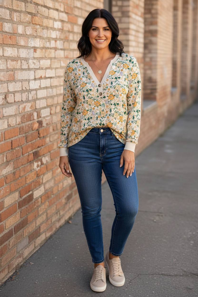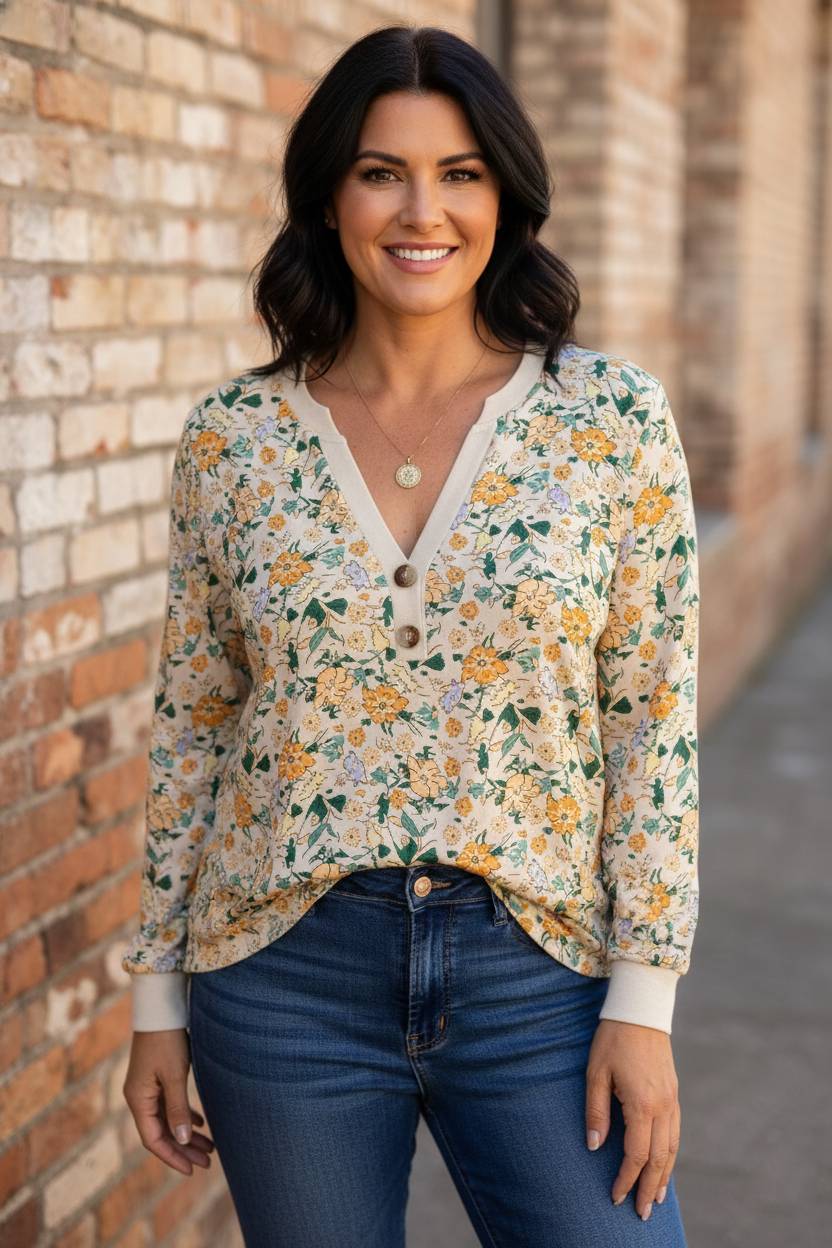 This cozy long-sleeve top features a beautiful all-over floral print in warm, soft colors (as shown: yellow, green, and cream). It's designed with a flattering notched neckline accented by a few charming button details at the collar. The soft, lightweight fabric and easy fit make it perfect for weekend errands, casual gatherings, or layering under a cardigan.