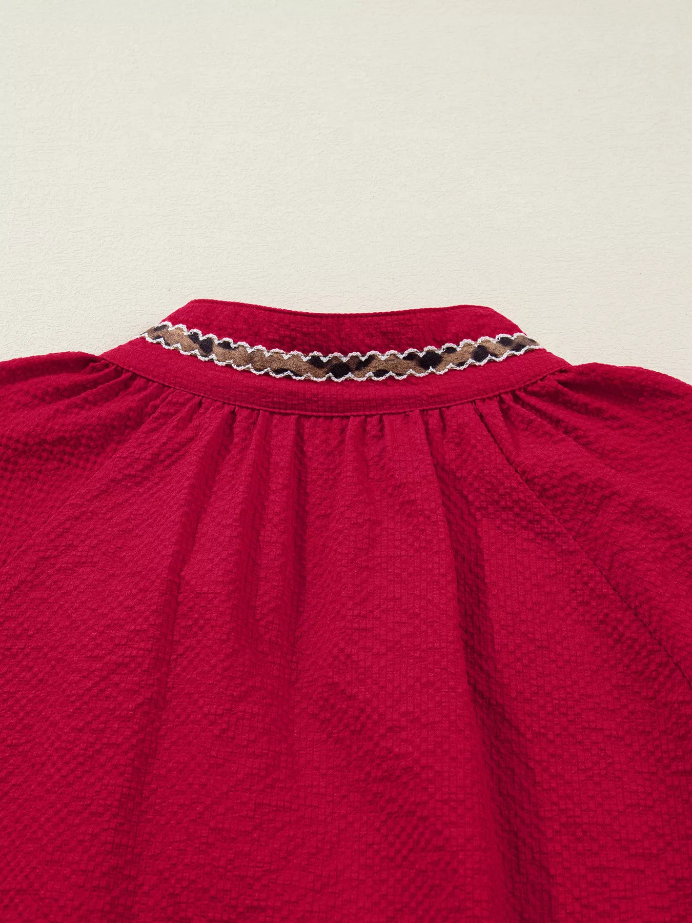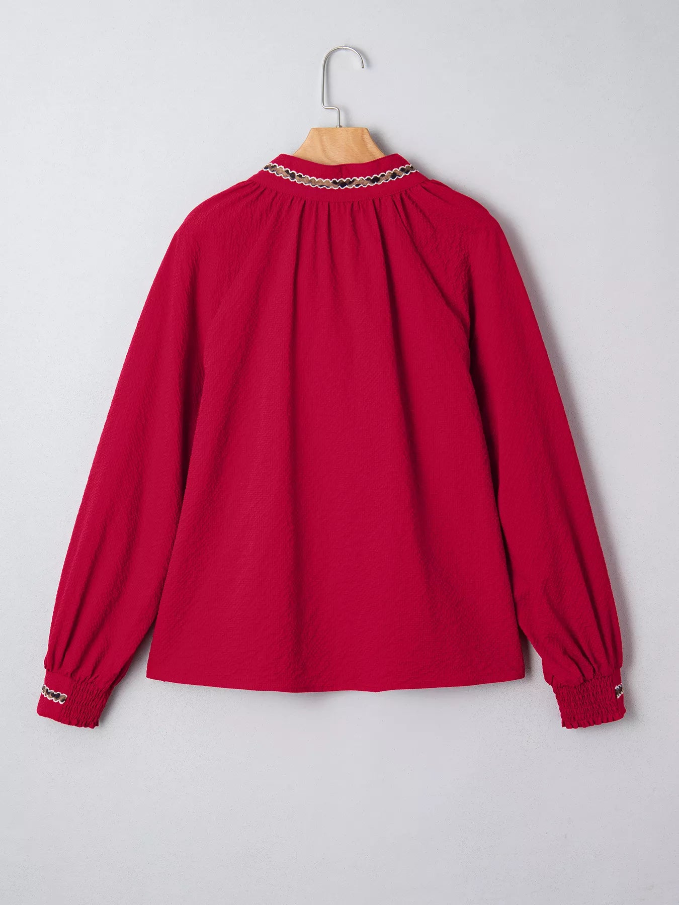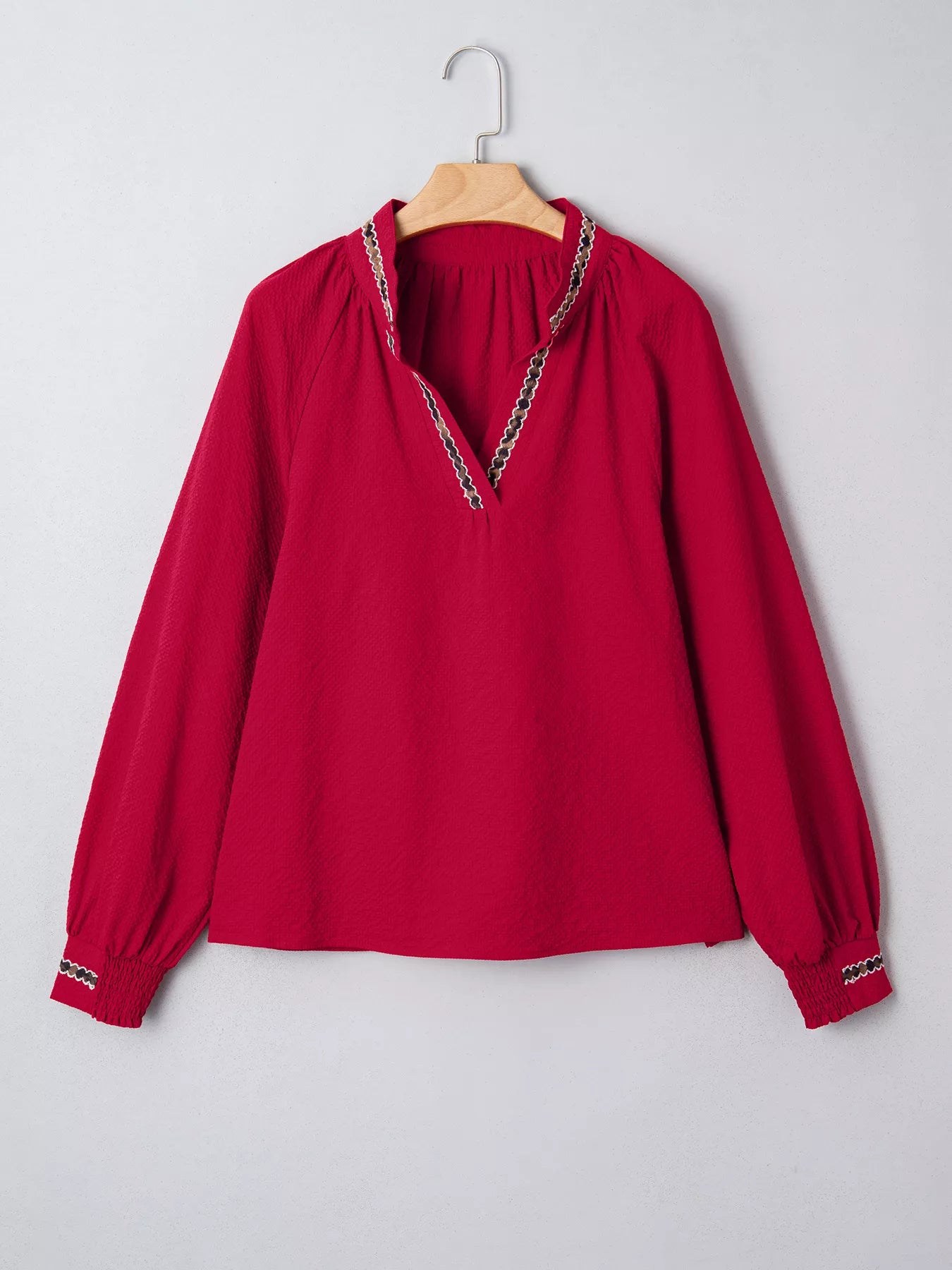The flattering notched V-neckline and subtly gathered front drape beautifully. You'll adore the voluminous, balloon-style long sleeves and cuffs, all detailed with intricate contrast trim, creating a romantic, high-fashion silhouette.