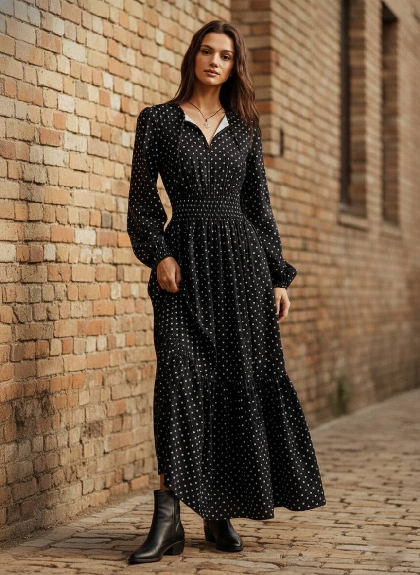 This gorgeous dress features a classic black hue detailed with a delicate, all-over white polka dot print. The design includes an elegant mandarin collar, a flattering ruched elastic waistline for a comfortable fit, and a long, tiered skirt. The sheer, billowing sleeves and delicate button cuffs add a touch of romantic sophistication, making it perfect for evening events or stylish daytime gatherings.