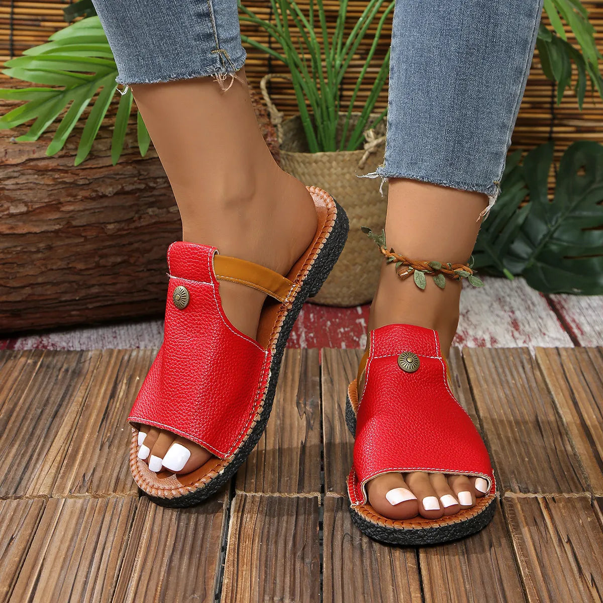 Step into carefree comfort with our Sunset Stroll Open Toe Sandals — the perfect blend of laid-back vibes and everyday style. These easygoing flats feature a soft PU leather upper with an eye-catching button accent, an open toe to show off that fresh pedi, and a secure slingback strap for effortless wear.