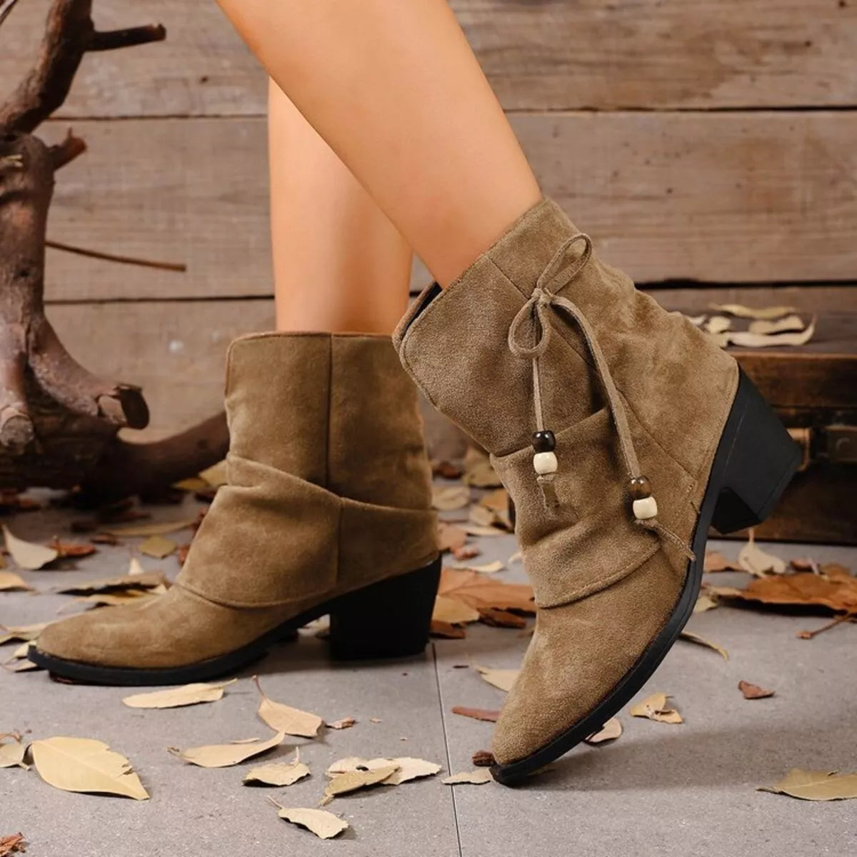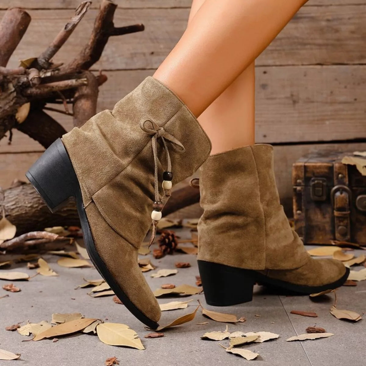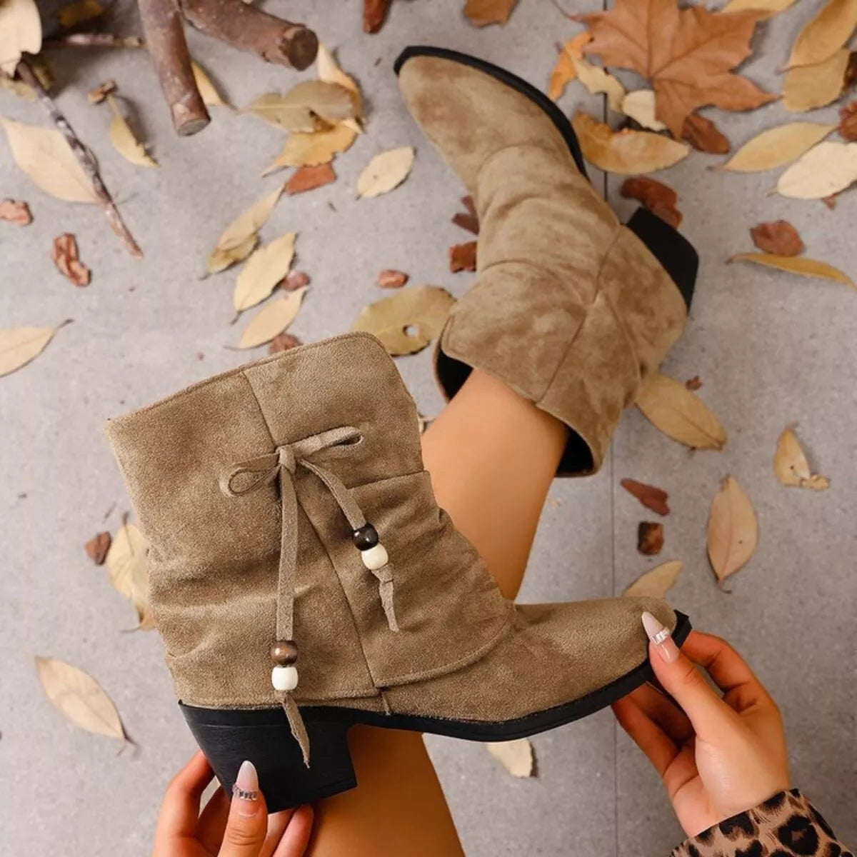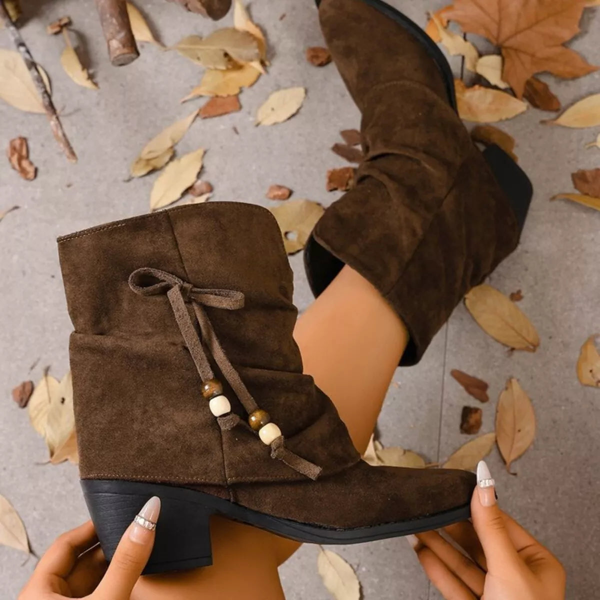 These gorgeous boots feature a soft, ruched faux suede shaft that creates a chic, slouchy look. The design is finished with a delicate bow accent tied with beaded ends, adding a touch of playful, bohemian flair. With a comfortable stacked block heel and a pointed toe, these boots are perfect for pairing with flowing dresses or skinny jeans for a perfectly styled autumn look.
