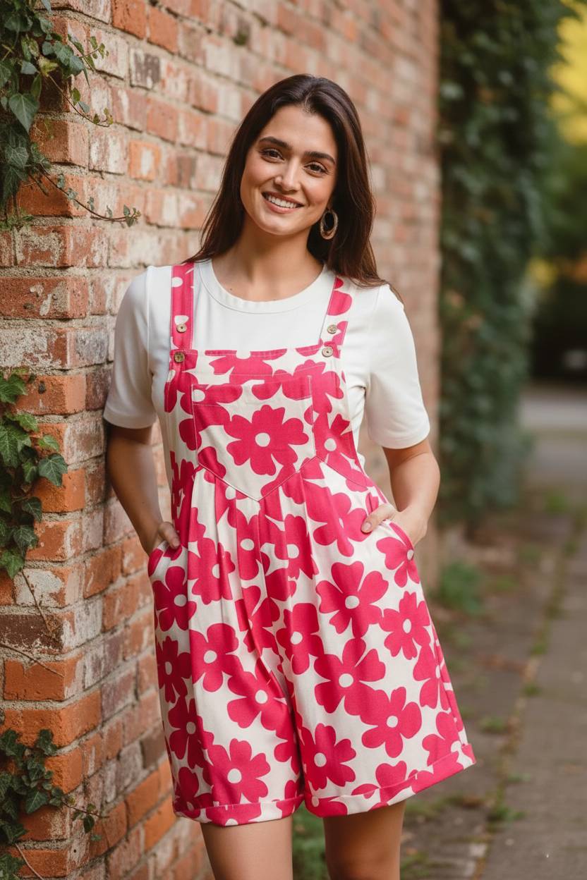 Step into a look that masters the art of playful charm and statuesque, warm-weather ease. These Picnic Perfection Shortalls feature a vibrant, large-scale pink floral print set against a crisp cream base, offering a curated boutique aesthetic for your sun-drenched social calendar. This contemporary silhouette is defined by its architectural tuck detail and functional side pockets, providing a "next level" look that balances feminine whimsicality with practical design. Crafted from a premium blend of 83% rayon and 17% nylon, these shortalls deliver a lightweight, breathable handle for ultimate all-day comfort.