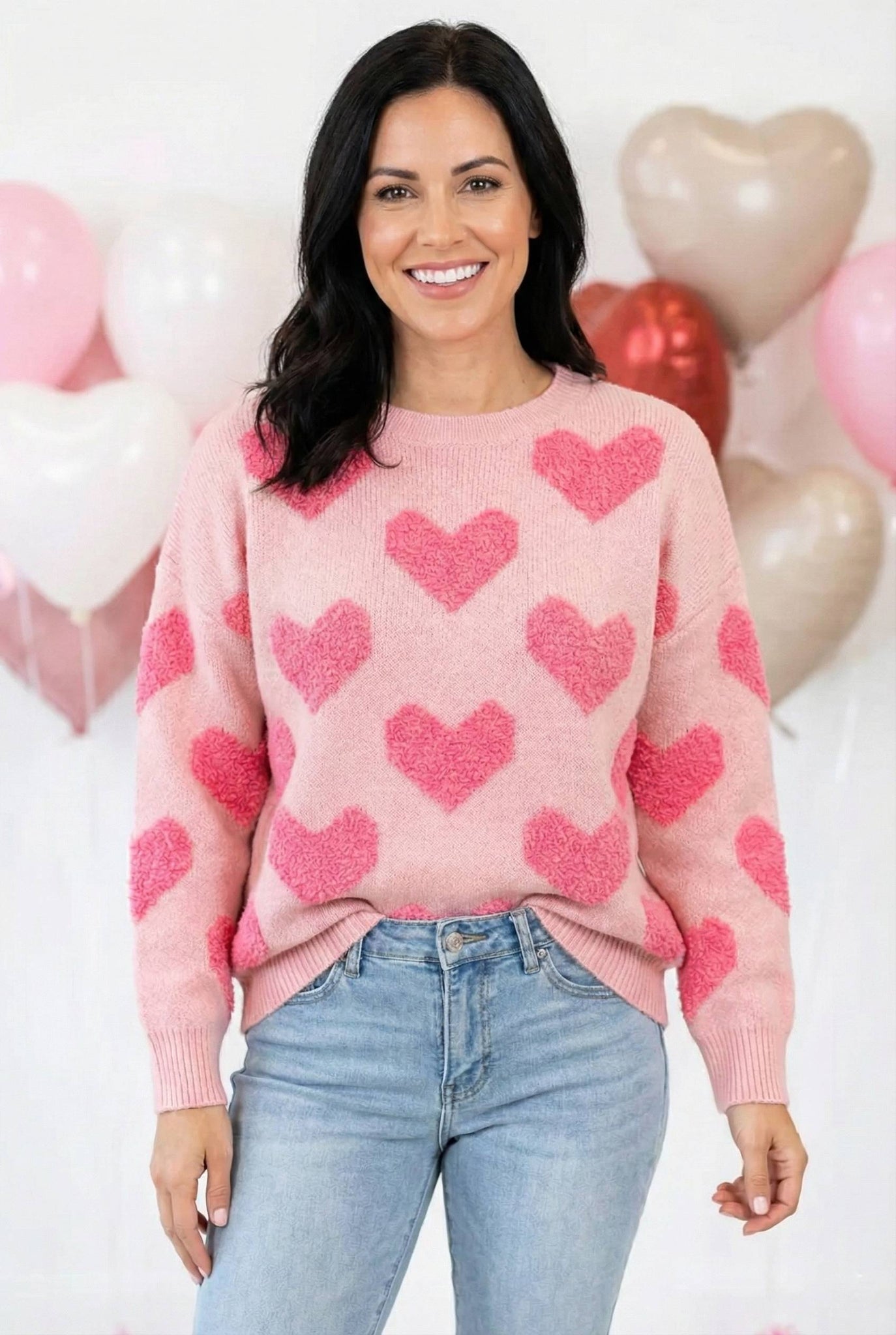 Fall head-over-heels for a look that combines high-fashion texture with a playful, romantic spirit. The Sweetheart Soirée Sweater is a seasonal standout, featuring an all-over jacquard-knit design of elevated, dimensional hearts that pop against a soft pastel background. Crafted with a classic round neckline and comfortable ribbed trim, this sweater provides a polished yet incredibly cozy silhouette. The premium blend of acrylic, polyester, and nylon offers a luxuriously soft hand-feel with a slight stretch, making it the perfect piece for a Galentine's brunch or a cozy Valentine's date night.