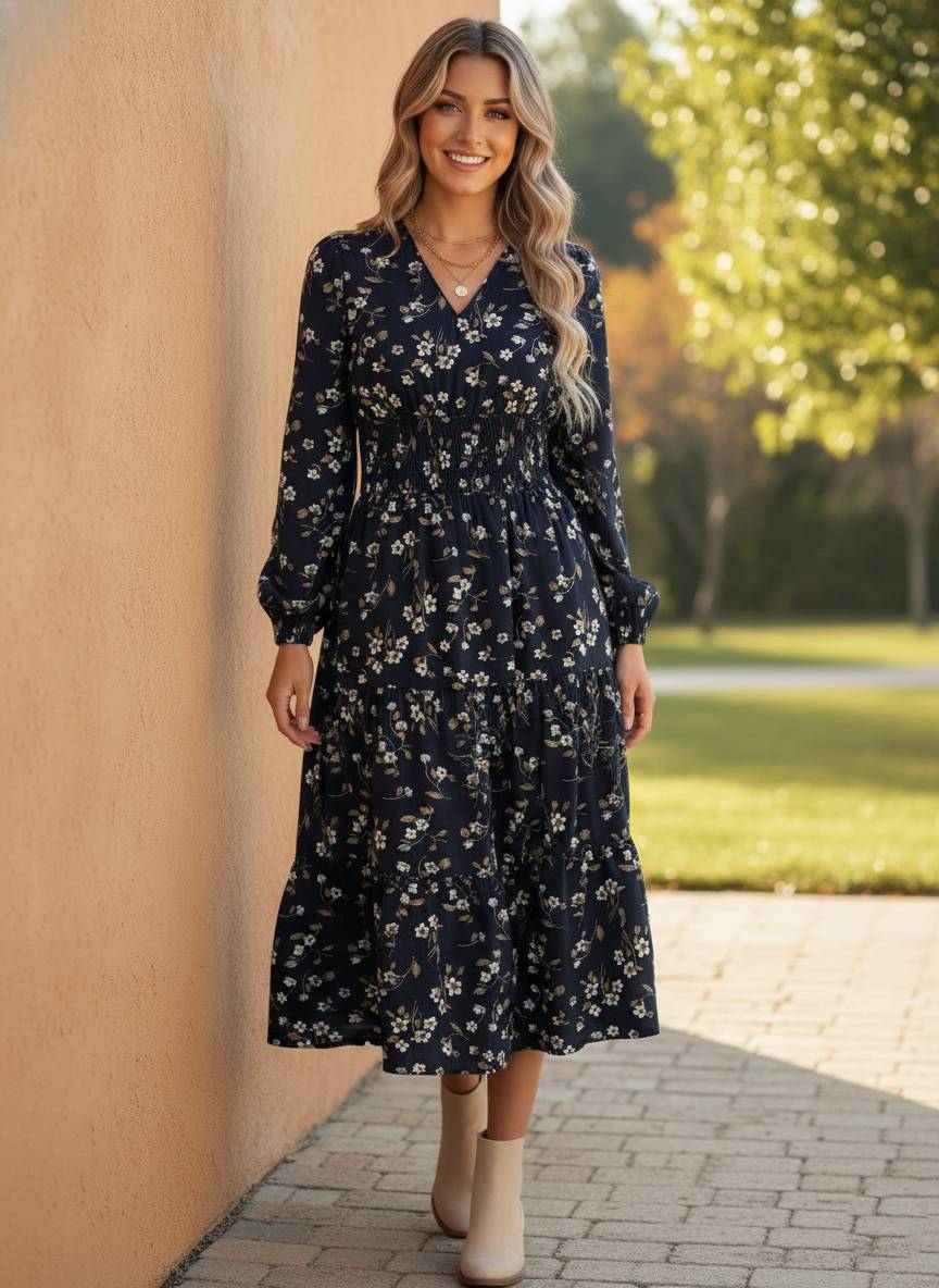 The Willow Lane Midi Dress brings soft romance and effortless charm together. Featuring delicate florals, a smocked waist for a flattering silhouette, and gentle tiered layers that sway with every step — this piece is perfect for a stroll through town or a cozy fall gathering.