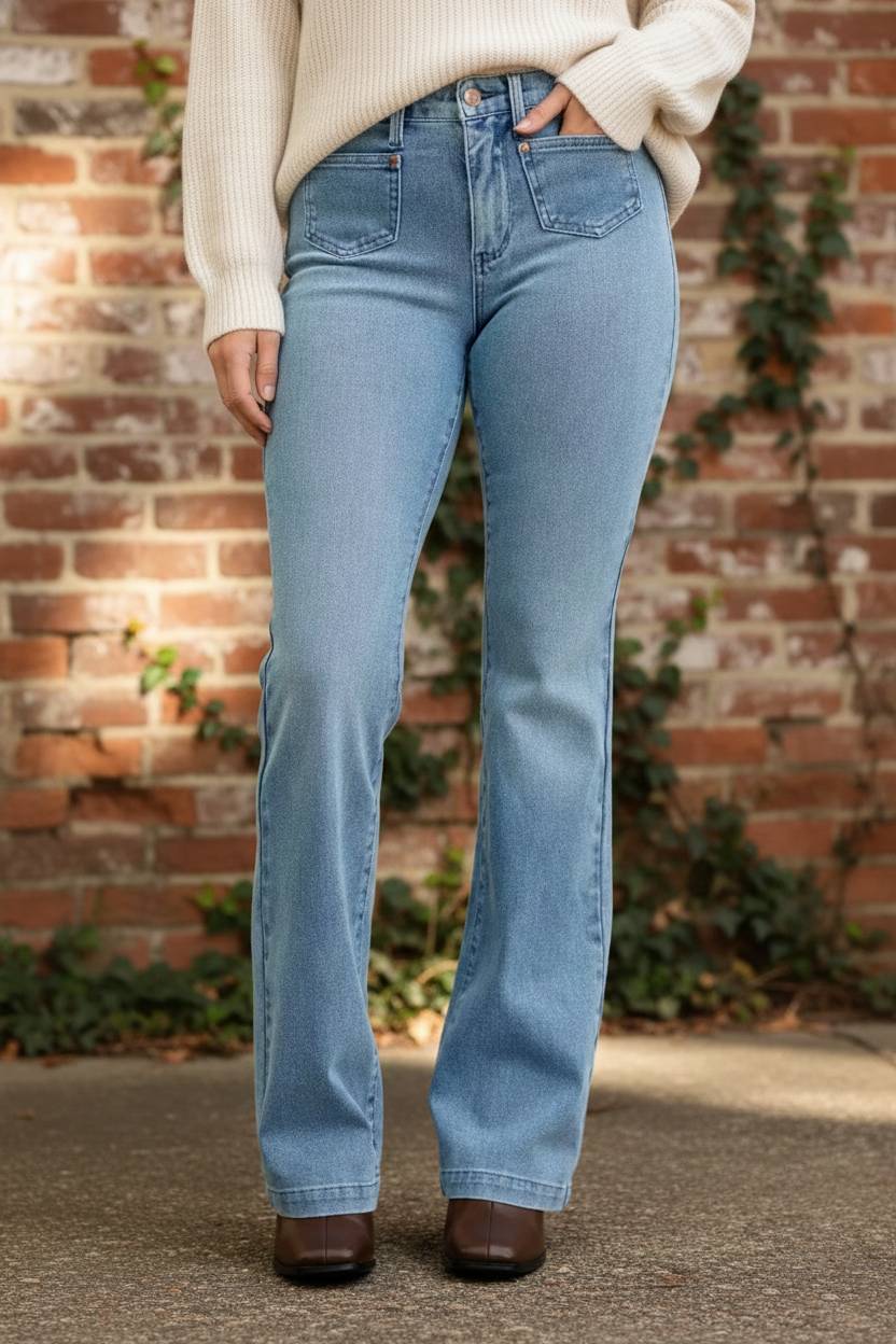 These Mid Rise Bootcut Jeans feature a stylish contrast wash and front patch pockets for a modern twist on a classic style. The mid-rise design offers a flattering fit that sits comfortably at the waist. The bootcut silhouette adds a touch of retro flair while elongating the legs. The contrast wash detailing adds visual interest and makes these jeans stand out from the crowd. Elevate your denim collection with these fashionable and edgy jeans that are sure to turn heads.