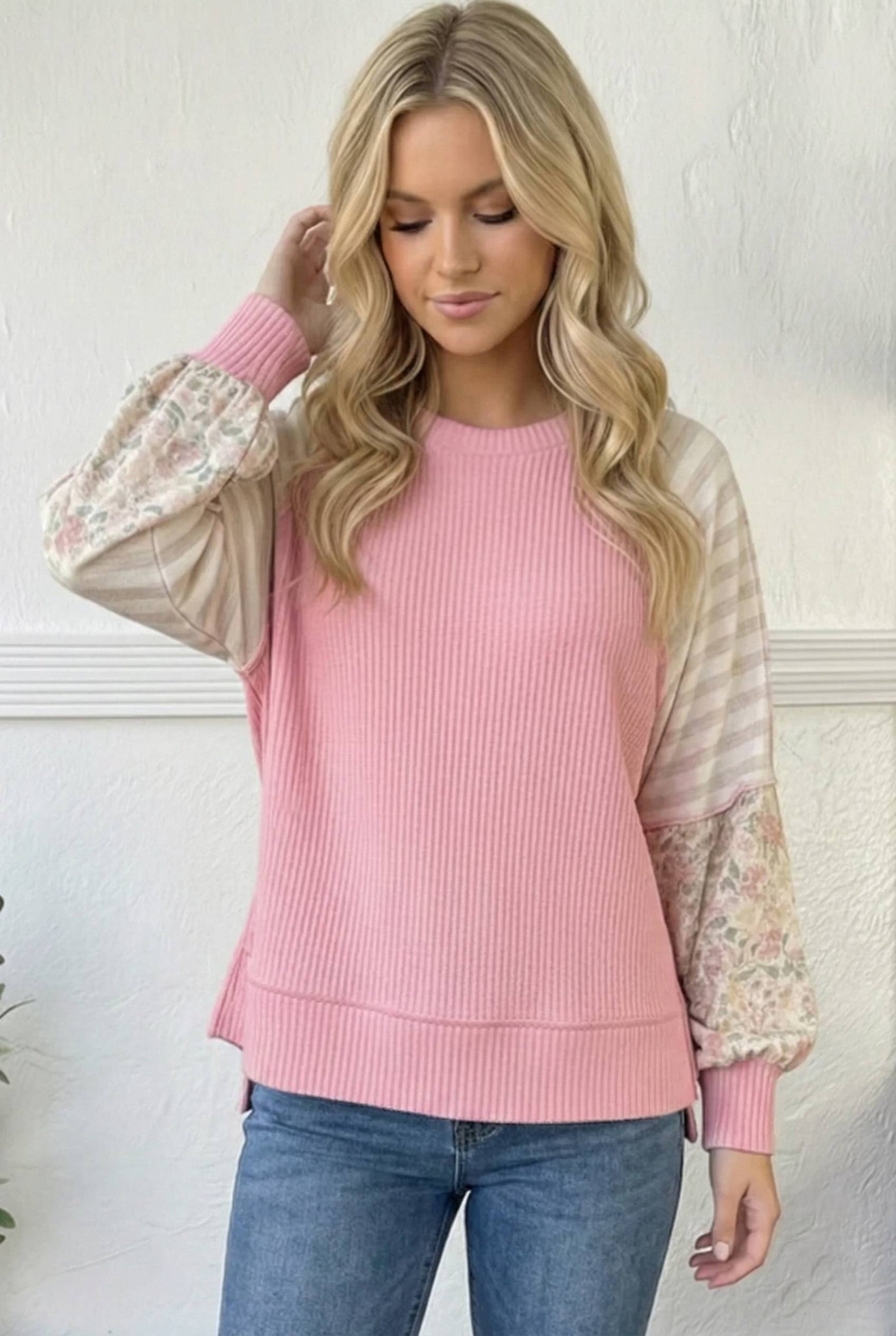 This sweet and cozy top is made to brighten your day. Featuring a soft blush pink ribbed body with playful mixed-print sleeves, it blends florals and subtle stripes for a perfectly unique look. The relaxed fit and lightweight feel make it comfy enough for all day wear, while the contrast details add just the right touch of charm. Style it with denim shorts, jeans, or leggings for an easy outfit that feels cute without trying too hard.