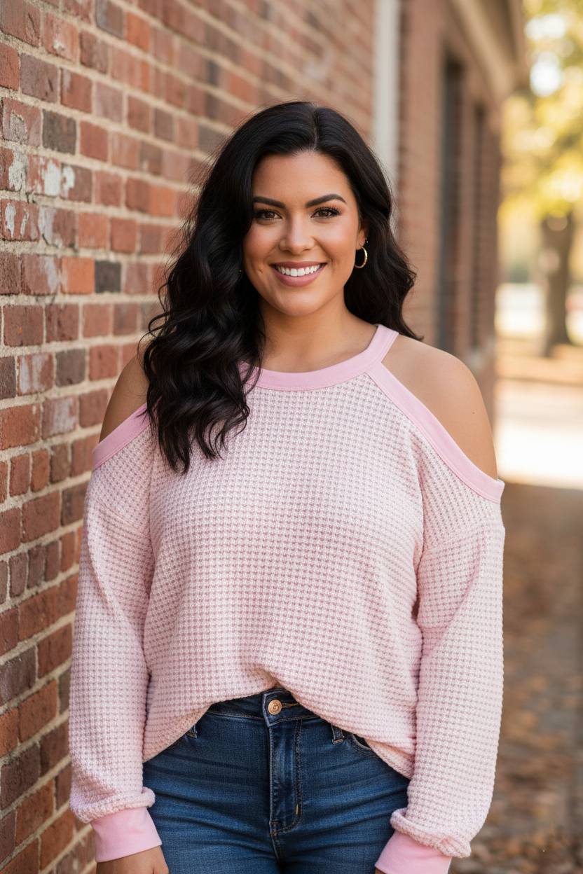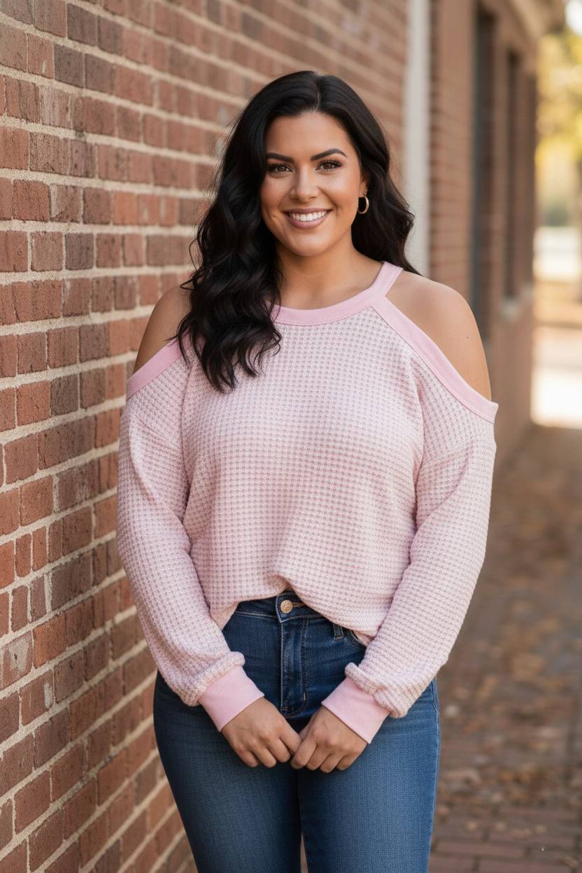 Elevate your casual essentials with a piece that masters the art of tactile texture and modern, statuesque charm. The Luna Lane Top features a unique popcorn waffle-knit fabric in a soft, blush pink hue, offering a curated boutique aesthetic for your daily rotation. This contemporary design is defined by its trendy cold-shoulder cutouts and a relaxed silhouette, providing a high-impact look that transitions effortlessly from day to evening. Crafted from a premium blend of 95% polyester and 5% spandex, this top delivers a soft-touch handle with slight stretch for ultimate daily ease.