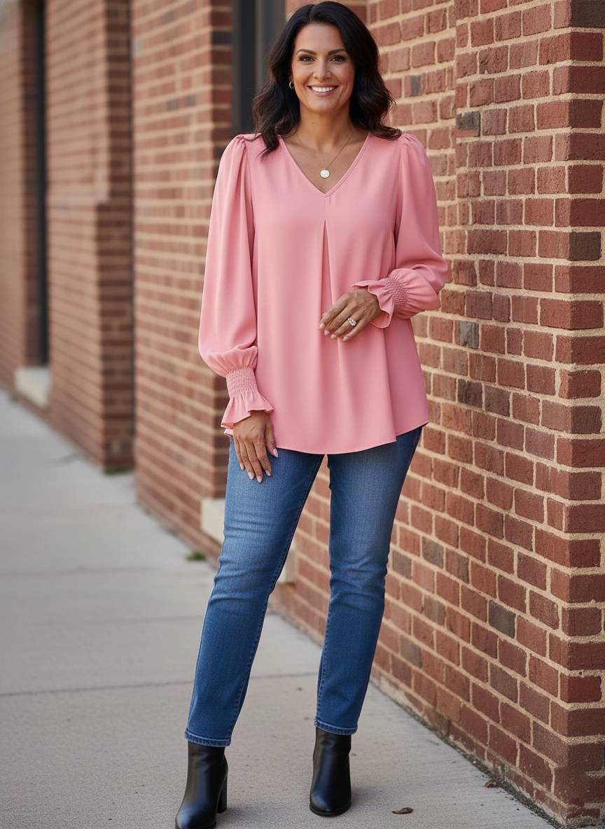 Infuse your professional and social wardrobe with a touch of romantic structure and feminine charm. The Everly Blouse is a masterclass in elegant detailing, featuring a graceful V-neckline and a distinctive center-front inverted pleat that creates a sophisticated, fluid drape. The true focal point lies in the dramatic smocked ruffle cuffs, which add a vintage-inspired "bishop sleeve" volume and a playful, tactile finish to the long sleeves. Crafted from a high-quality, smooth-finish fabric, this blouse offers a polished look that resists wrinkling, making it an effortless choice for tucked-in styling with high-waisted trousers or left loose over sleek denim for a refined casual ensemble.