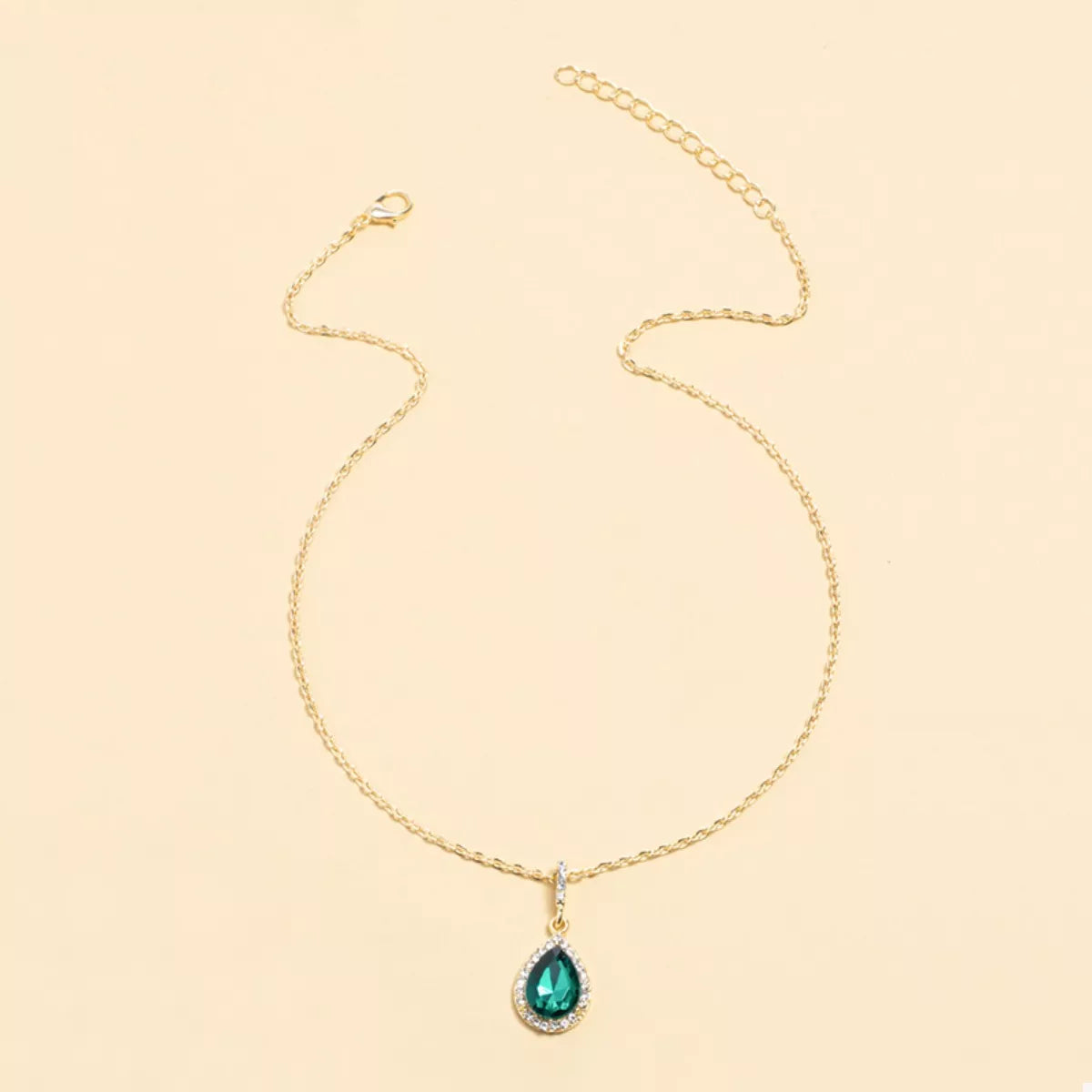 The focal point is the stunning teardrop-shaped crystal pendant, meticulously faceted to catch the light from every angle, creating a captivating sparkle. The vivid green stone is surrounded by a brilliant halo of smaller, shimmering crystals, providing incredible depth and radiance.