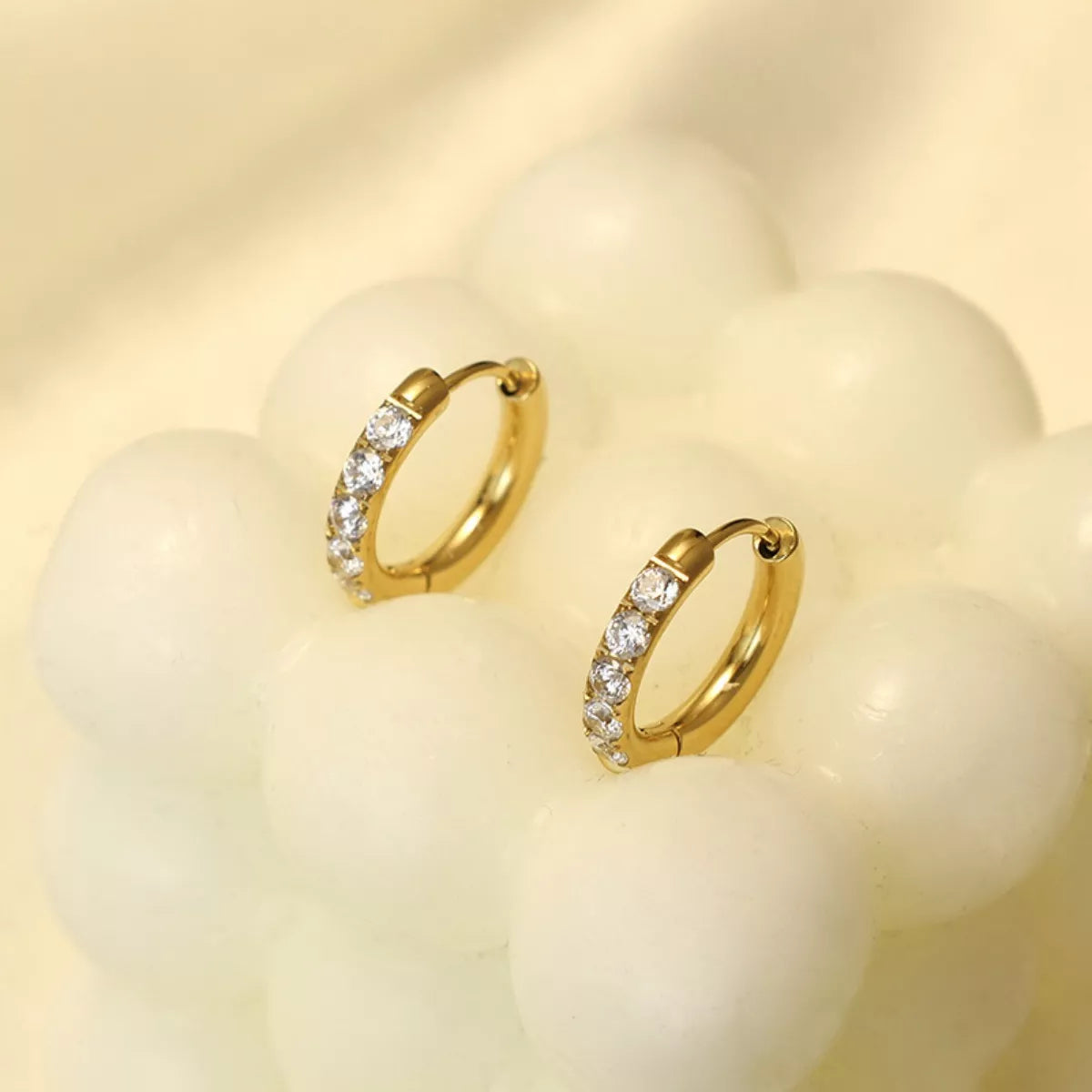 These petite huggie hoop earrings are designed to sit close to the earlobe for a comfortable, chic fit. They feature a delicate row of shimmering Zircon stones set into the front surface, catching the light with every turn. Made from durable Titanium Steel and finished with rich 18K Gold Plating, these earrings offer timeless style and exceptional quality.
