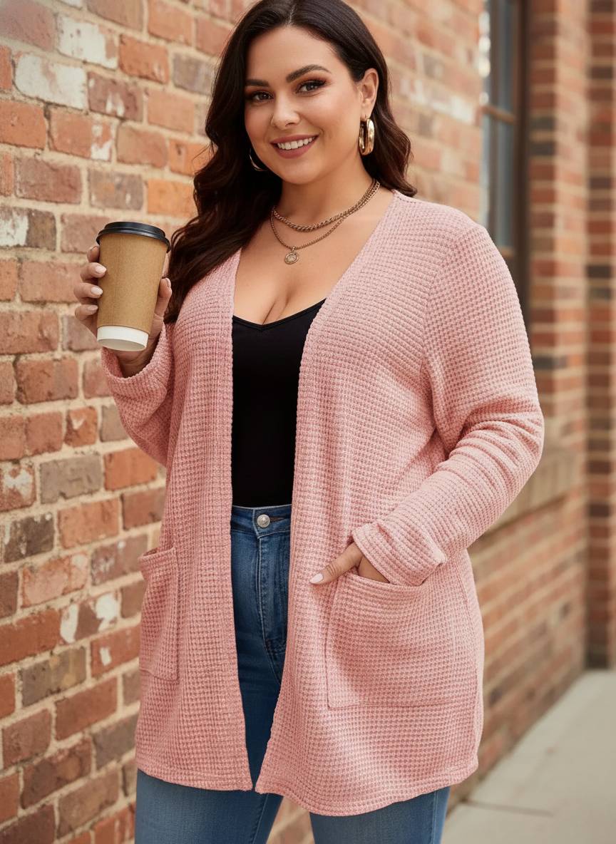 This open-front cardigan is made from a soft, lightweight waffle-knit fabric that provides excellent texture and warmth without the bulk. The relaxed fit, dropped shoulders, and mid-thigh length create a flattering drape over any outfit. Complete with deep side pockets for convenience, this piece is perfect for tossing over a t-shirt or tank on a chilly morning.
