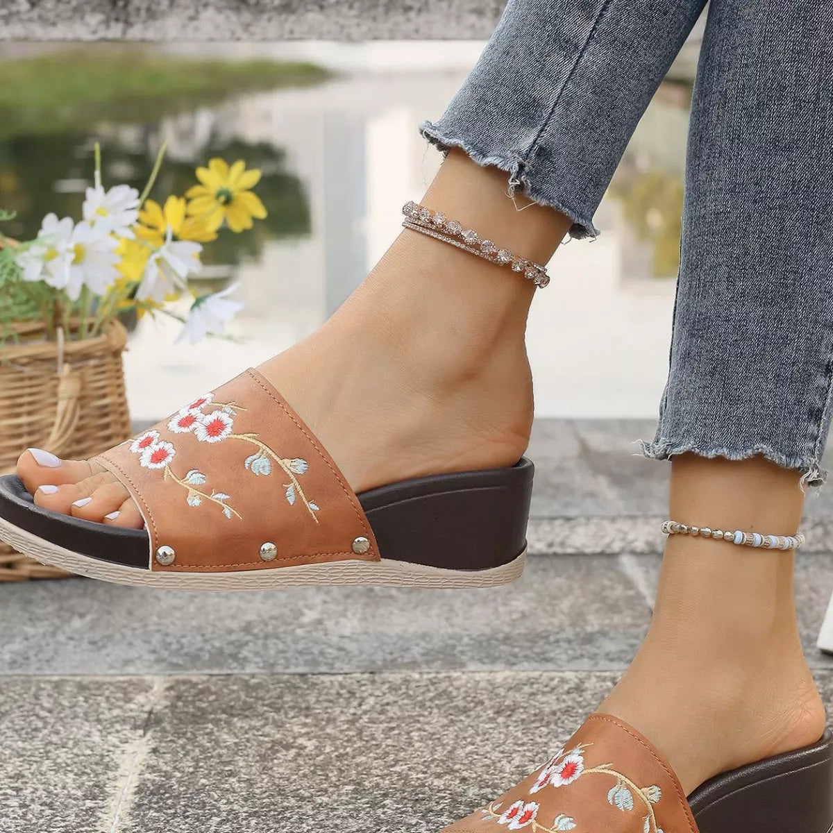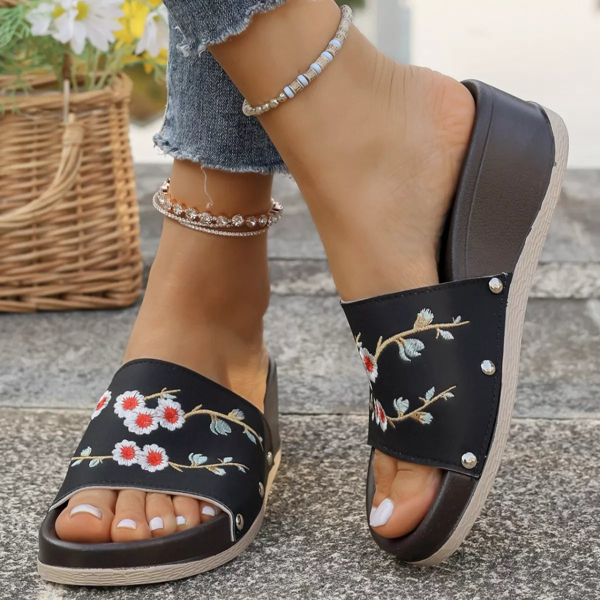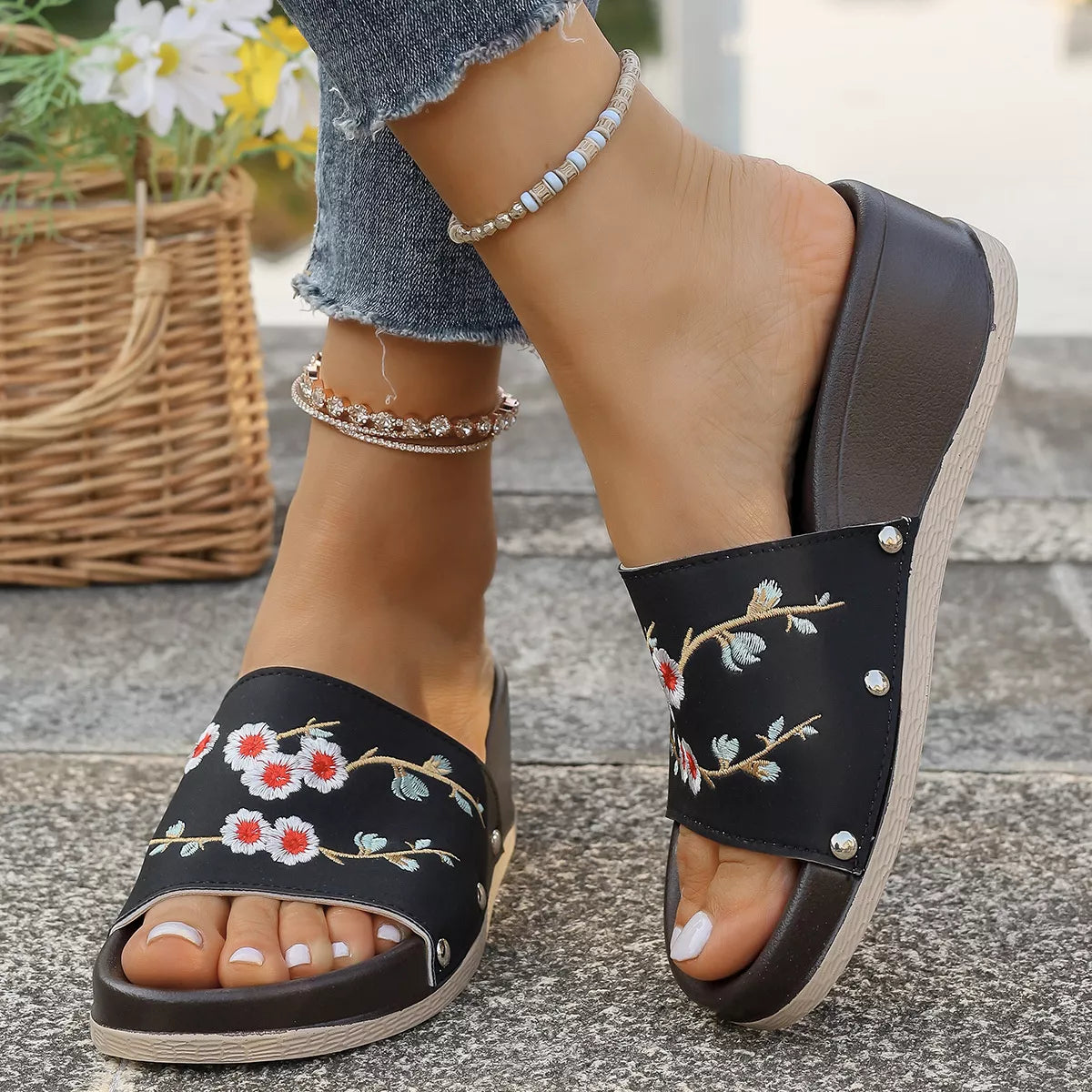 Step into a world of artisanal charm and effortless comfort. These Floral Embroidered Wedge Sandals are designed for the woman who loves a touch of traditional craftsmanship paired with a modern, walkable silhouette. Featuring intricate floral embroidery across the single-strap upper, these wedges bring a soft, botanical energy to your every step.