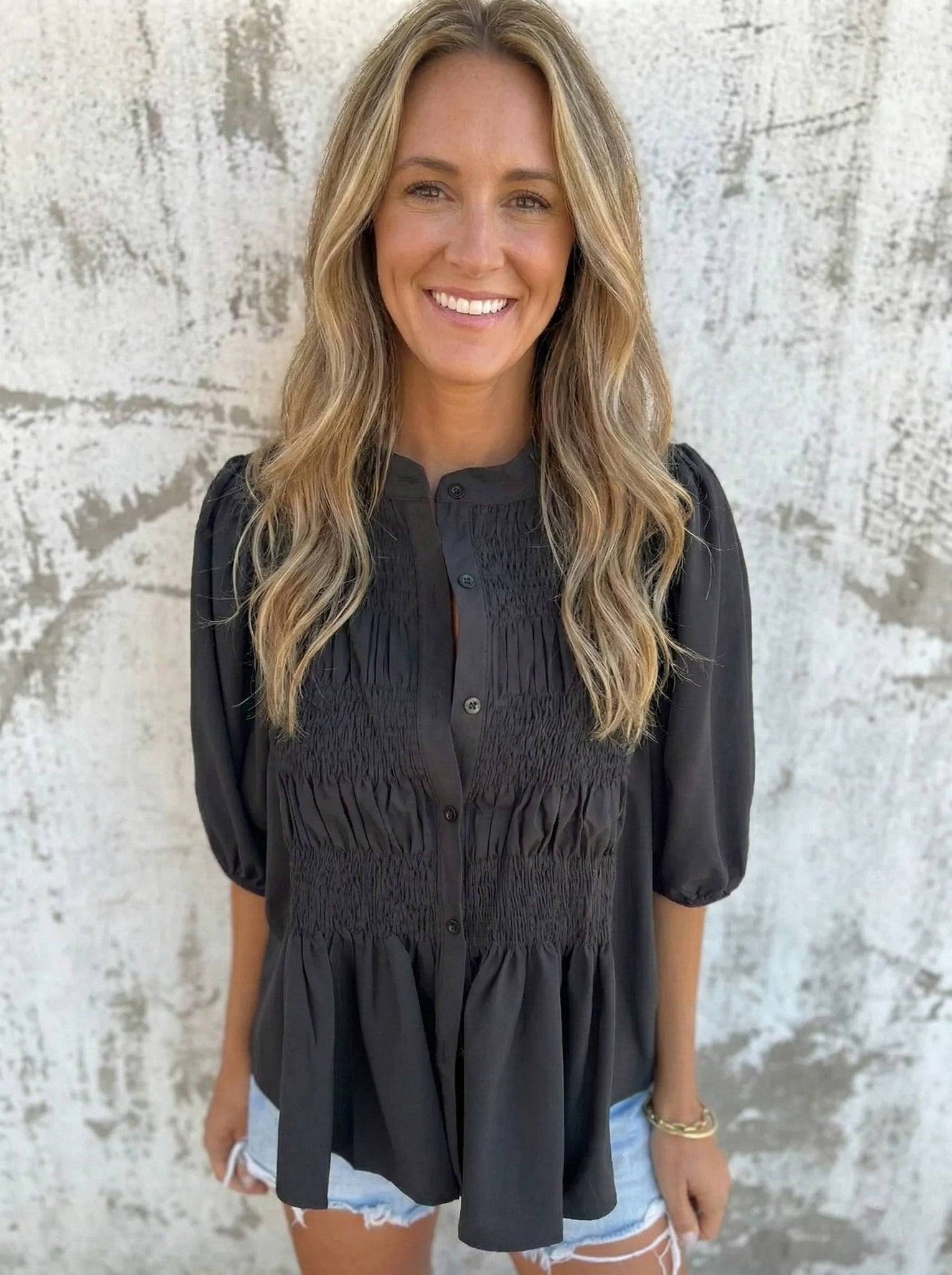 Infuse your wardrobe with a touch of artisanal charm in a top that celebrates texture and volume. This blouse features a fully smocked bodice that creates a sophisticated, gathered effect, flowing into a playful peplum-style hem. With its vintage-inspired puff sleeves and functional button-down front, it’s the perfect blend of romantic detail and modern ease.