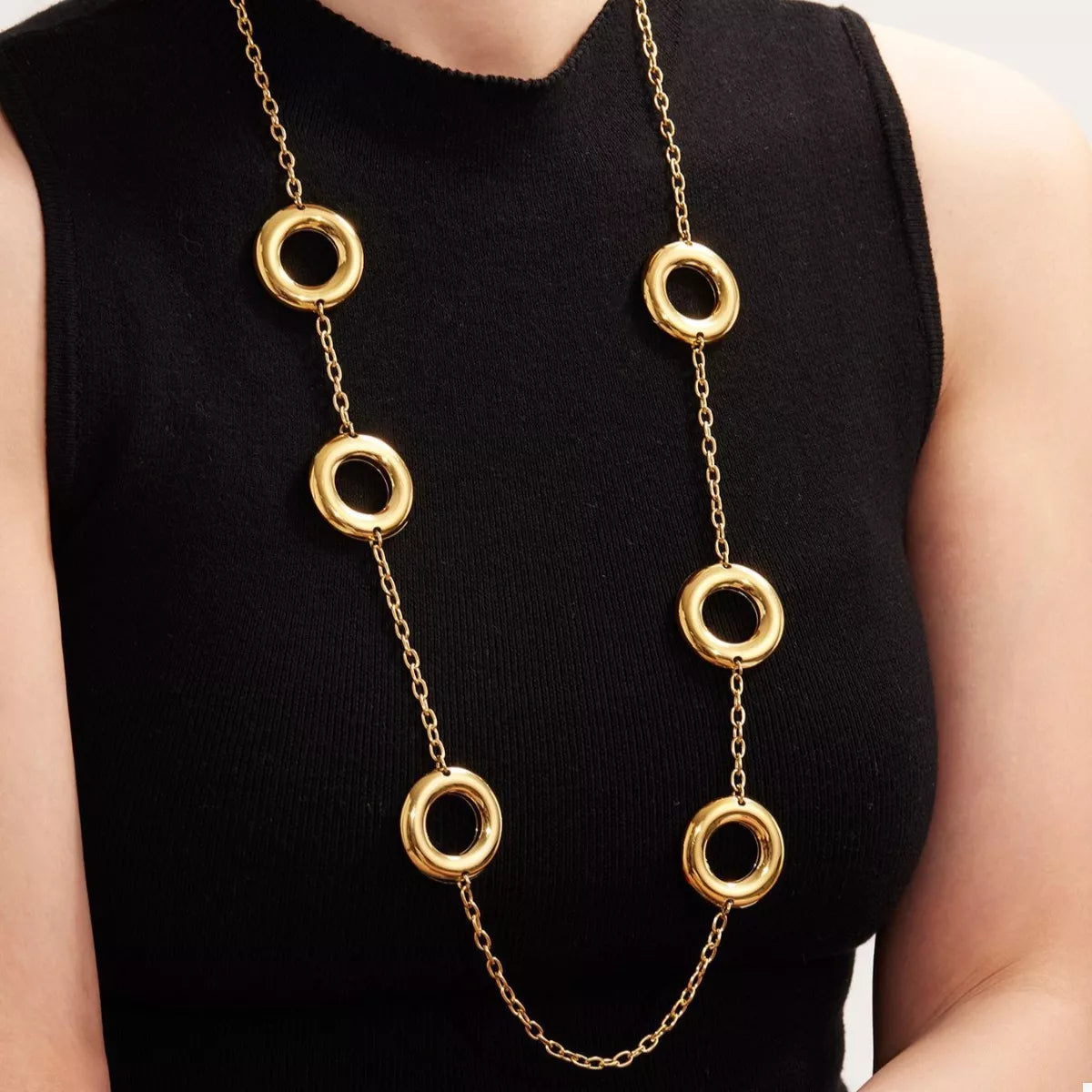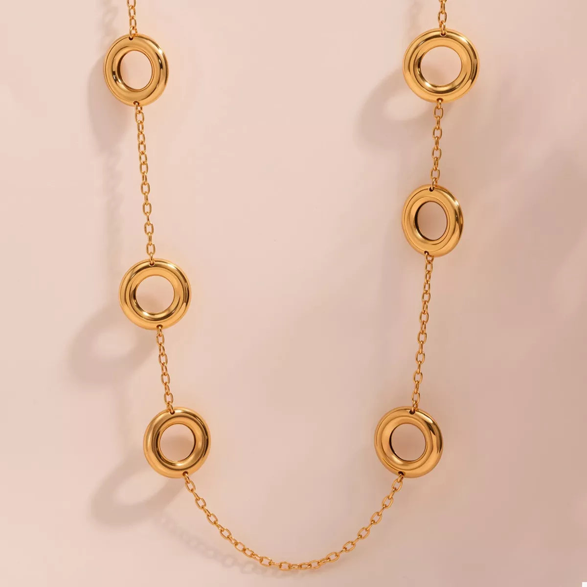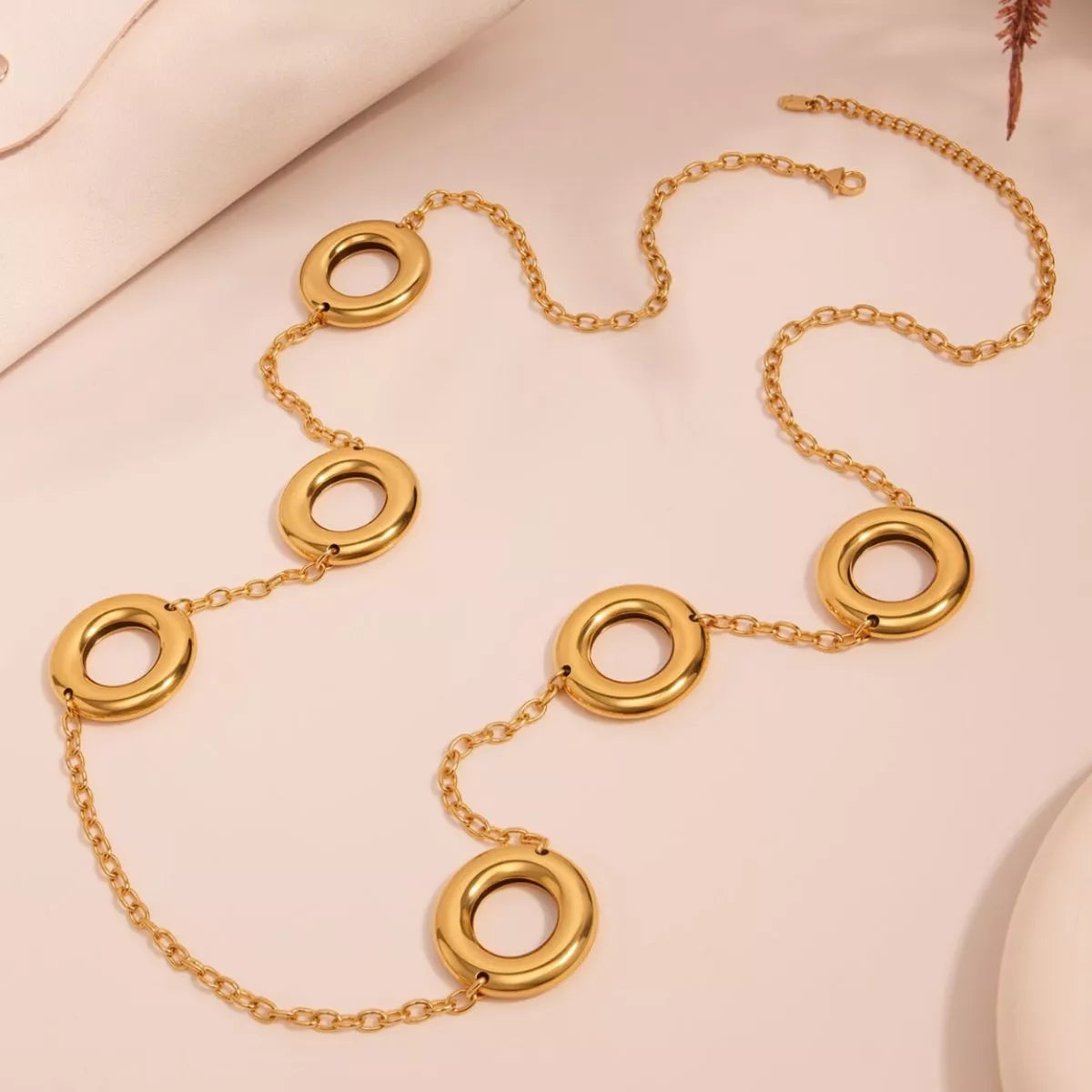 Sleek, bold, and striking — the Modern Loop Necklace redefines statement style with its sculptural circle links and gleaming 18K gold-plated finish. Each polished ring is crafted from durable titanium steel, giving this piece both elegance and lasting strength.