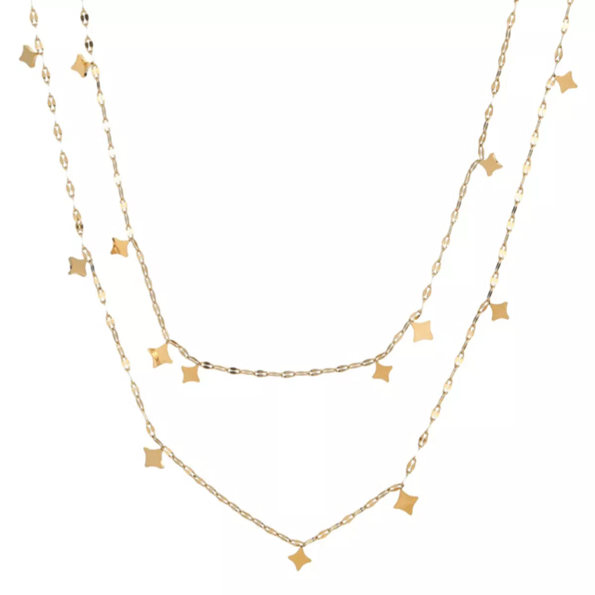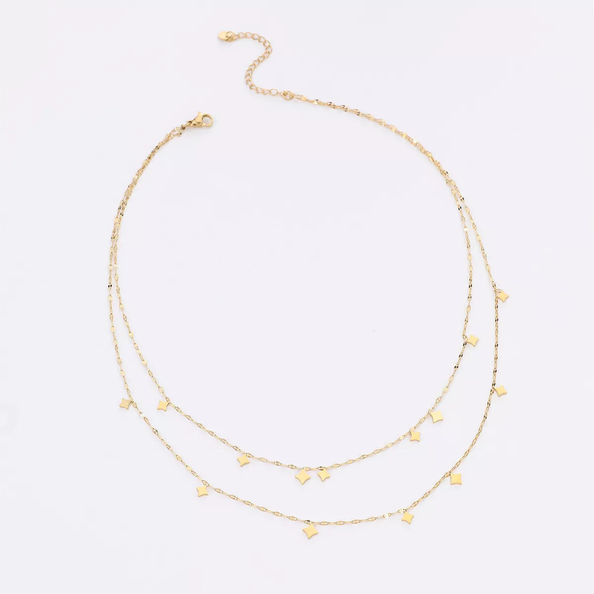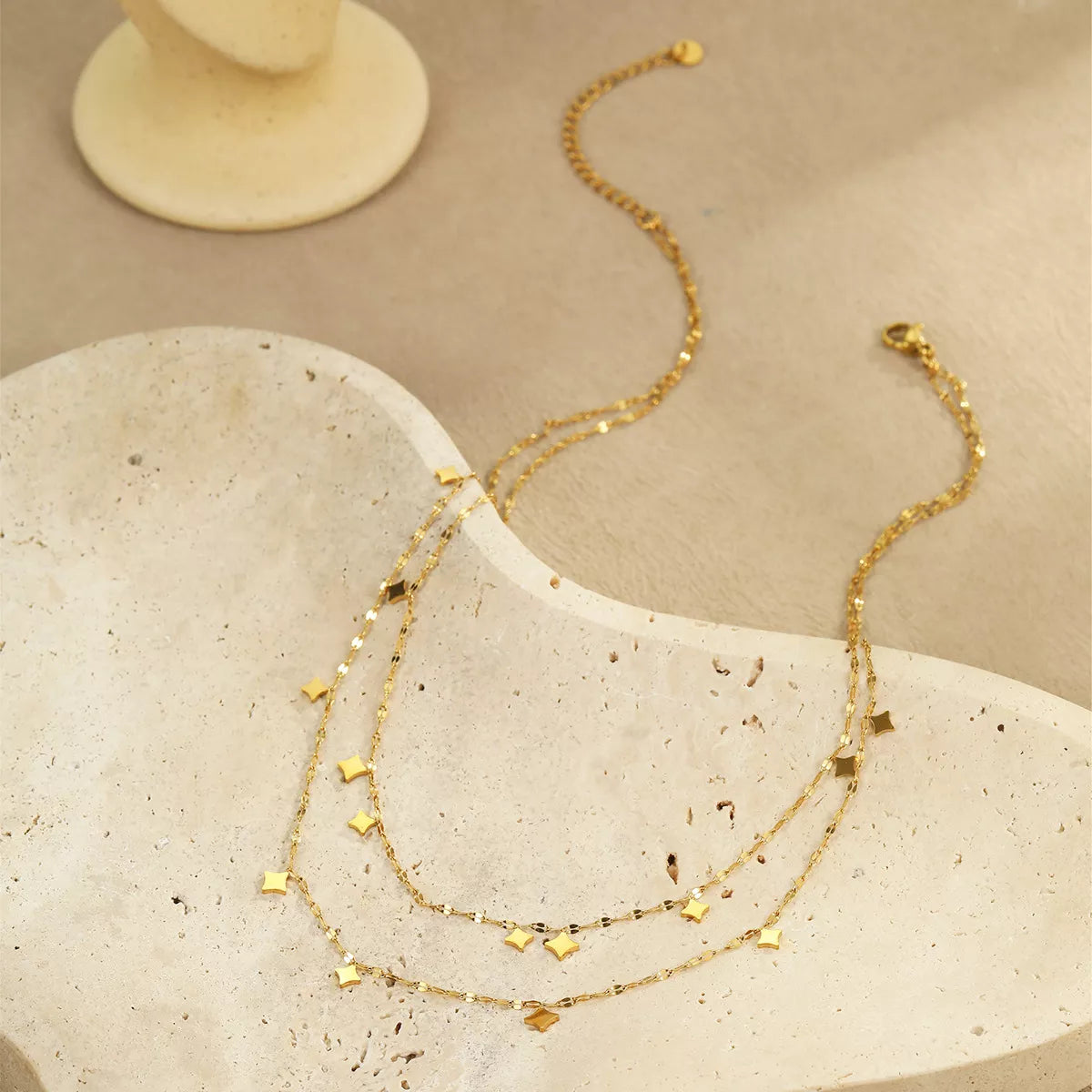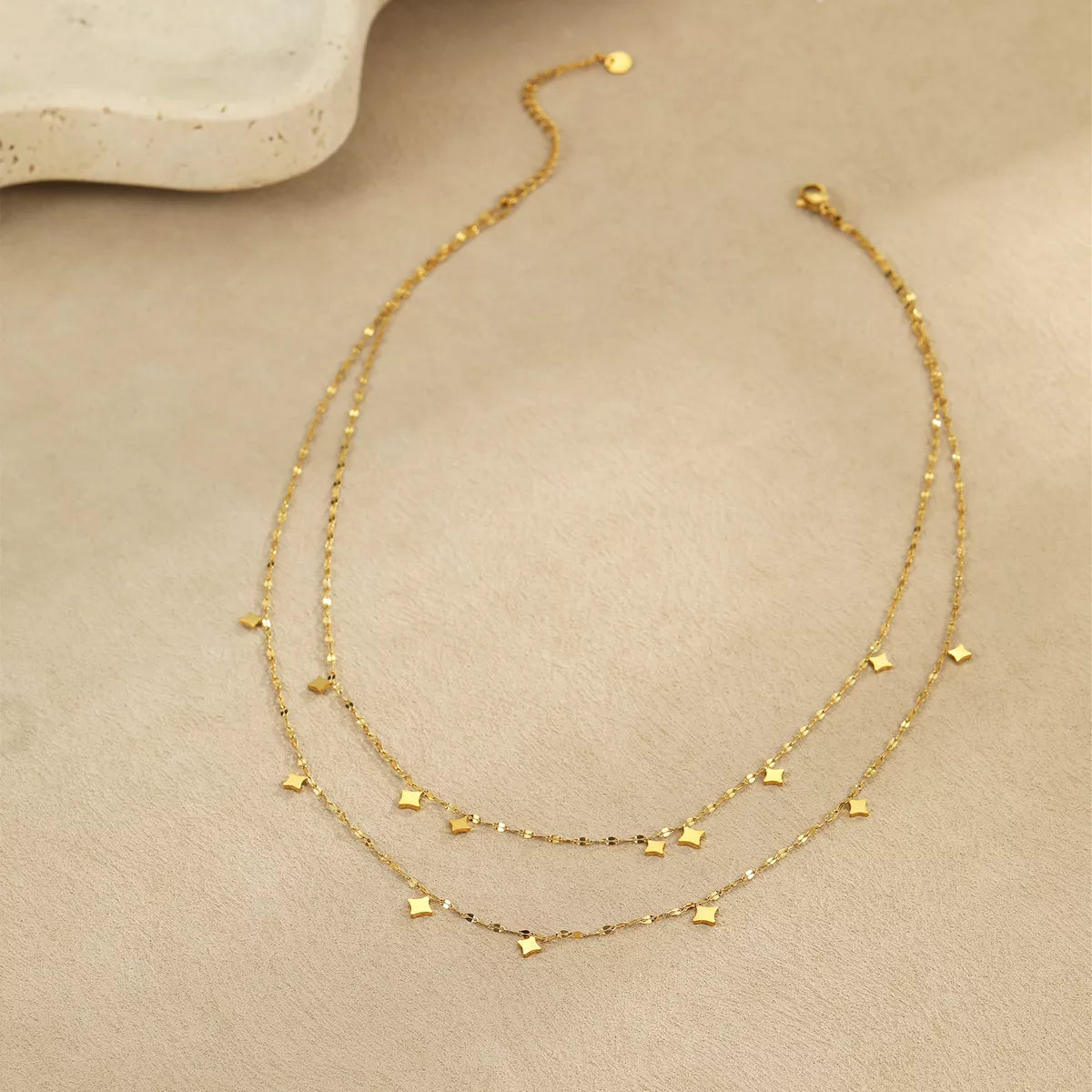 Elevate your presence with an artisanal accessory designed for high-end boutique elegance and a statuesque, shimmering allure. The Stellar Stream Necklace features a delicate layered design with multiple dainty star charms, offering a curated aesthetic that adds a "next level" glow to your daily rotation. This contemporary essential is defined by its architectural, fine-link chains and a sophisticated, muted gold finish, providing a polished and spirited vibe for any social occasion. Crafted from premium 18K gold-plated stainless steel, this 1-piece accessory delivers a high-fashion handle with reliable, long-lasting shine.