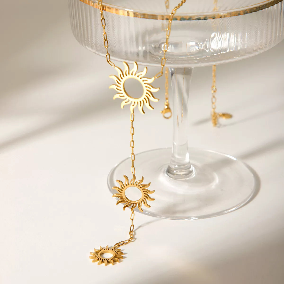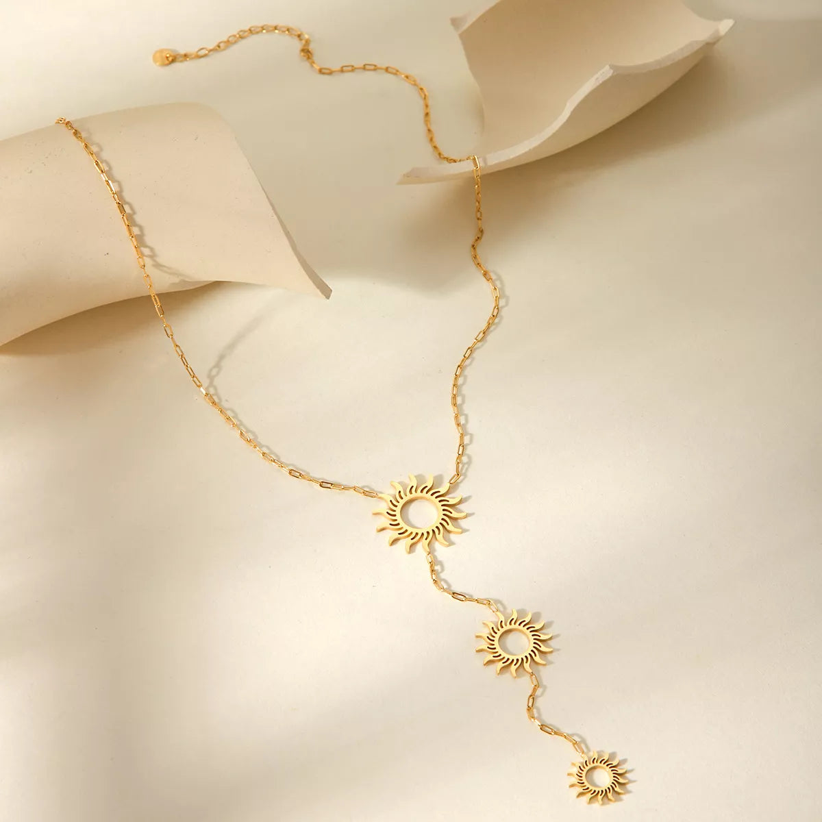 This stunning 18K Gold-Plated Sun Pendant Necklace features a beautifully crafted celestial sun charm suspended from a delicate gold-plated chain. The pendant showcases intricate sun ray details that catch and reflect light beautifully. Made with high-quality 18K gold plating over base metal for durability and tarnish resistance. The necklace offers versatile styling options, perfect for layering with other pieces or wearing alone as a statement accessory. Ideal for women who appreciate celestial-themed jewelry and elegant minimalist designs. The adjustable chain ensures comfortable fit while the sun pendant adds a touch of warmth and positive energy to any outfit.
