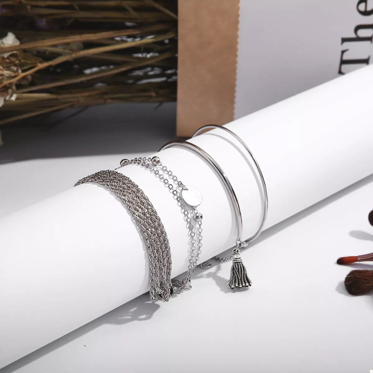 Get the perfect wrist stack instantly with the Effortless Layers Silver Arm Party! This stunning 4-piece set has been curated to give you high-impact style without the hassle of matching individual bracelets. Each piece offers a different texture, including a sleek, smooth cuff bangle, a delicate multi-strand chain, a fine chain with a disc charm, and a textured chain with a dangling silver tassel charm. Plated in radiant Silver, this set is designed to be worn all at once for maximum impact or mixed and matched with your existing jewelry.