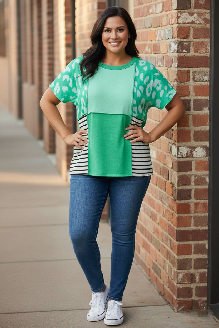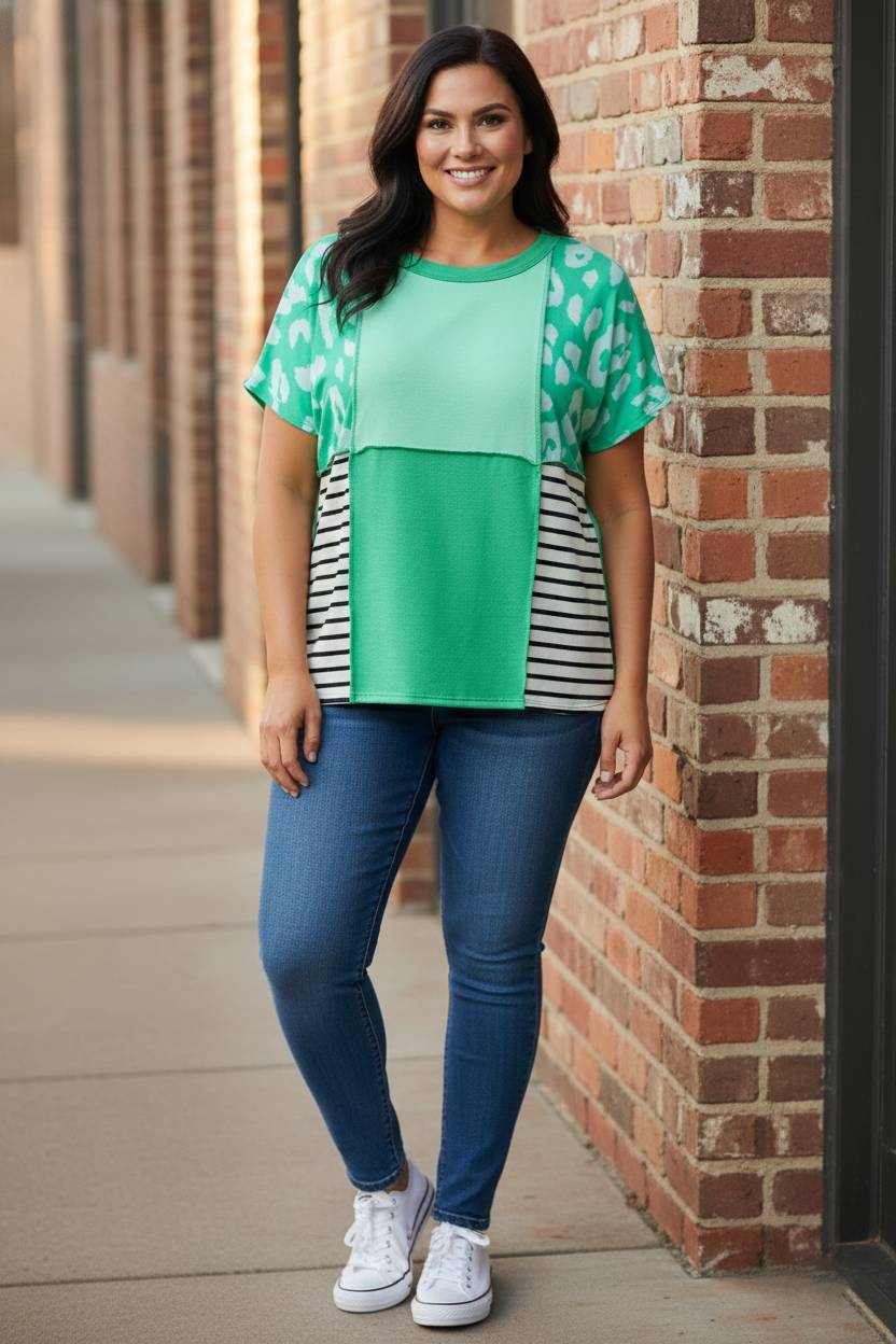 Redefine your casual rotation with a piece that masters the art of bold pattern-mixing and statuesque, modern flair. The Enigma & Edge Top by BiBi features a high-impact fusion of vibrant green leopard print and classic monochrome stripes, offering a curated boutique aesthetic for your daily wardrobe. This contemporary essential is defined by its architectural color block design and unique exposed seam detailing, providing a touch of edgy sophistication to a relaxed silhouette. Crafted from a premium blend of 95% polyester and 5% spandex, this top delivers a soft-touch handle with slight stretch for ultimate ease and a polished, urban profile.
