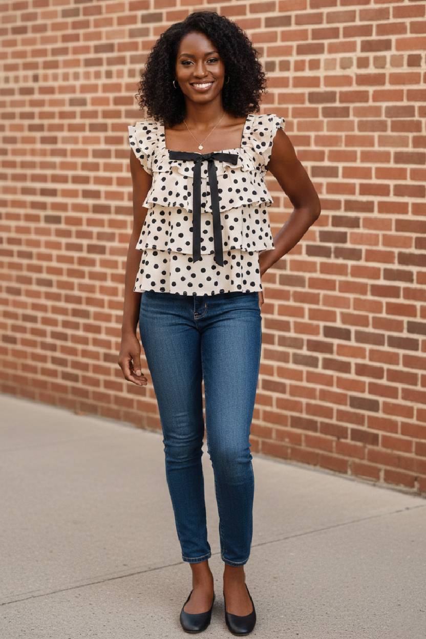 Infuse your warm-weather rotation with a piece that masters the art of playful vintage charm and curated boutique detail. The Darling Dot Top features a timeless polka dot print and architectural layered ruffles, offering a statuesque and feminine silhouette for any sun-drenched occasion. This charming design is defined by a sophisticated square neckline and a delicate bow tie accent, creating a polished focal point that transitions effortlessly from a garden brunch to an evening out. Crafted from a premium blend of a 100% polyester shell and a 100% cotton contrast, this sleeveless top provides a crisp, no-stretch handle that maintains its voluminous, tiered profile through every wear.