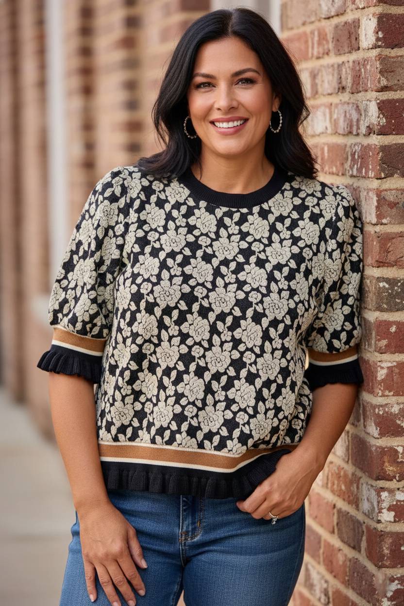 The Midtown Manor Top features a beautifully raised, jacquard-style textured rose motif in a classic monochrome palette. The silhouette is defined by dramatic puff sleeves and a structured hem, both accented with a striking tri-color contrast band in cream, caramel, and black. Finished with a delicate ruffled trim at the cuffs and hemline, this top offers a polished, feminine aesthetic that transitions effortlessly from a professional setting to an elegant evening out.