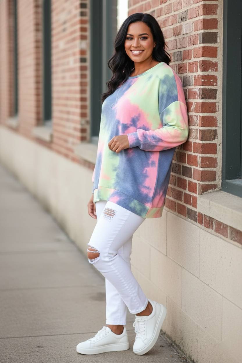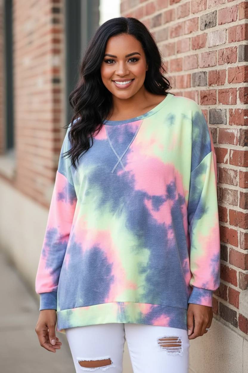 Step into a look that masters the art of high-impact color and statuesque, off-duty ease. The Watercolor Wishes Top is defined by a dreamy tie-dye print in a fusion of soft neon, sunset pink, and deep indigo hues, ensuring every piece is a unique, fashion-forward statement. This contemporary essential is crafted from premium, cozy French terry fabric, providing a lightweight and breathable handle that balances a "next level" aesthetic with ultimate daily comfort. Designed with a blend of 95% polyester and 5% spandex, this top delivers a soft-touch profile with slight stretch for a curated boutique feel.