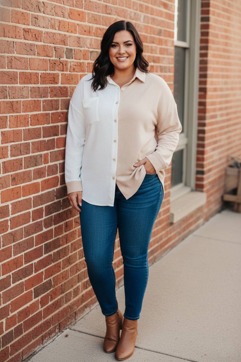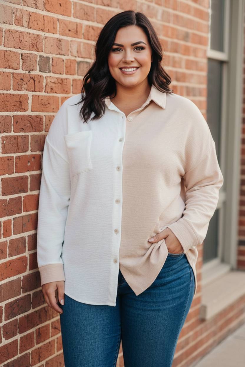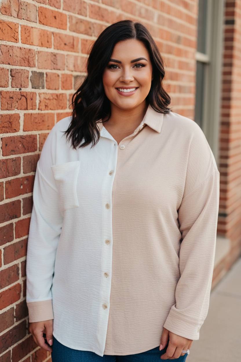 Our Block Party Button Down is perfect for your laidback style. Featuring a textured fabric, ivory and taupe color block design, and a classic collared button down style, you'll love the modern feel of this timeless look.