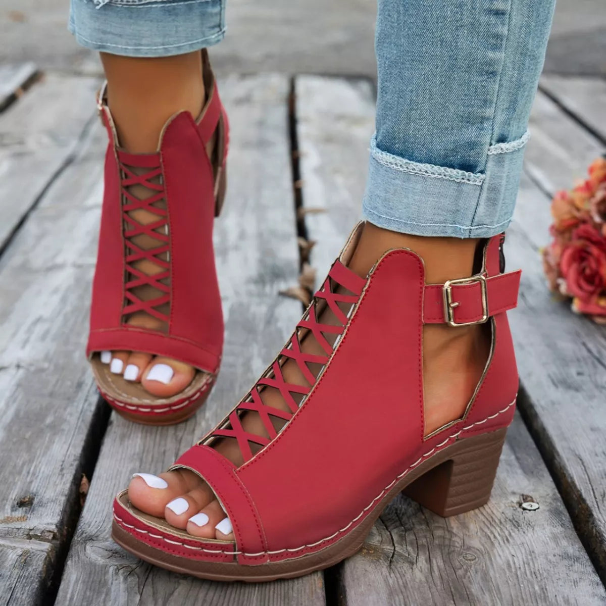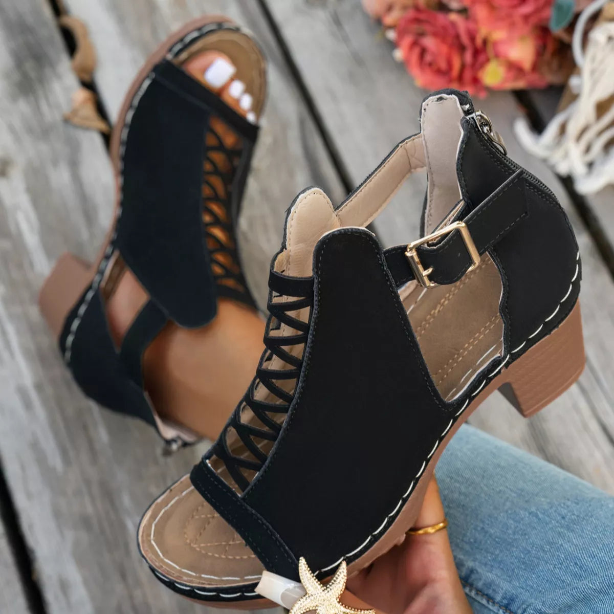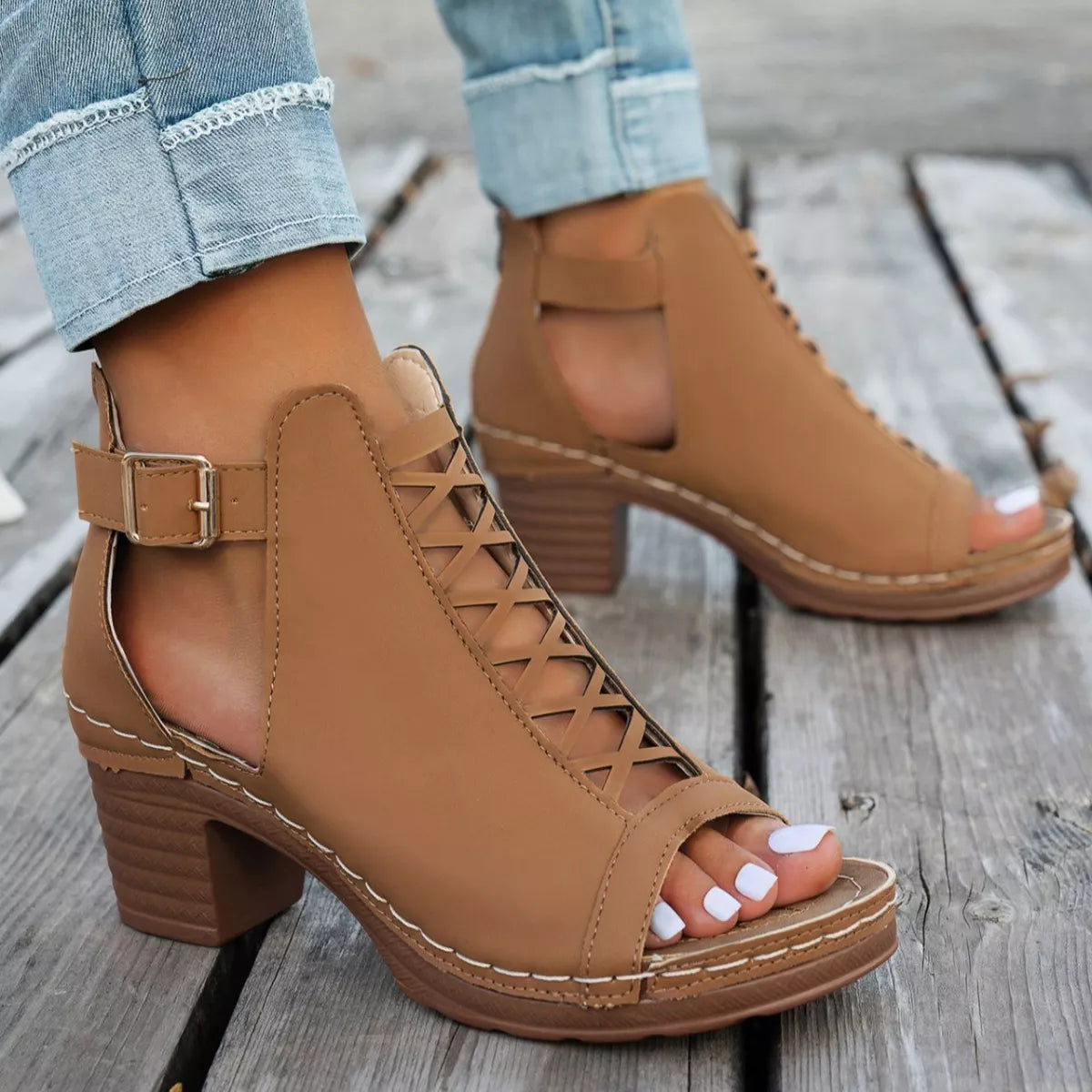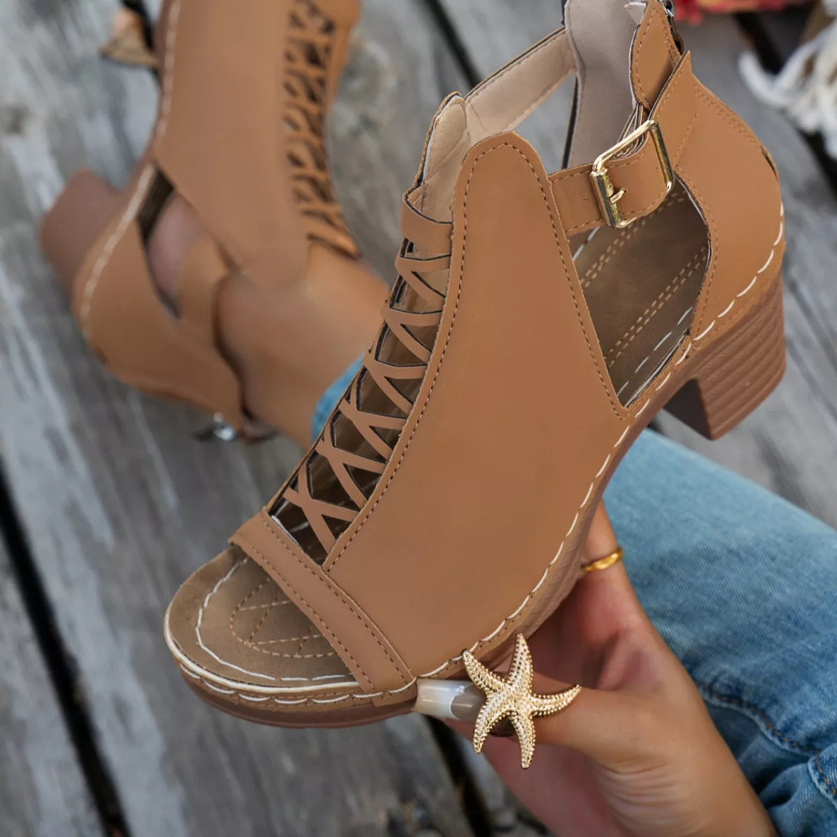 Elevate your presence with a statuesque footwear essential designed for high-end boutique style and effortless transitions. The Urban Uplift Sandals feature a bold, cage-style silhouette with intricate lace-up detailing, offering a curated aesthetic that adds a "next level" edge to your seasonal rotation. This contemporary design is defined by its polished gold-toned buckle and architectural frame, providing a spirited boutique vibe for everything from brunch dates to evening social gatherings. Crafted from premium PU vegan leather, these sandals deliver a high-fashion handle with a sophisticated, muted finish.